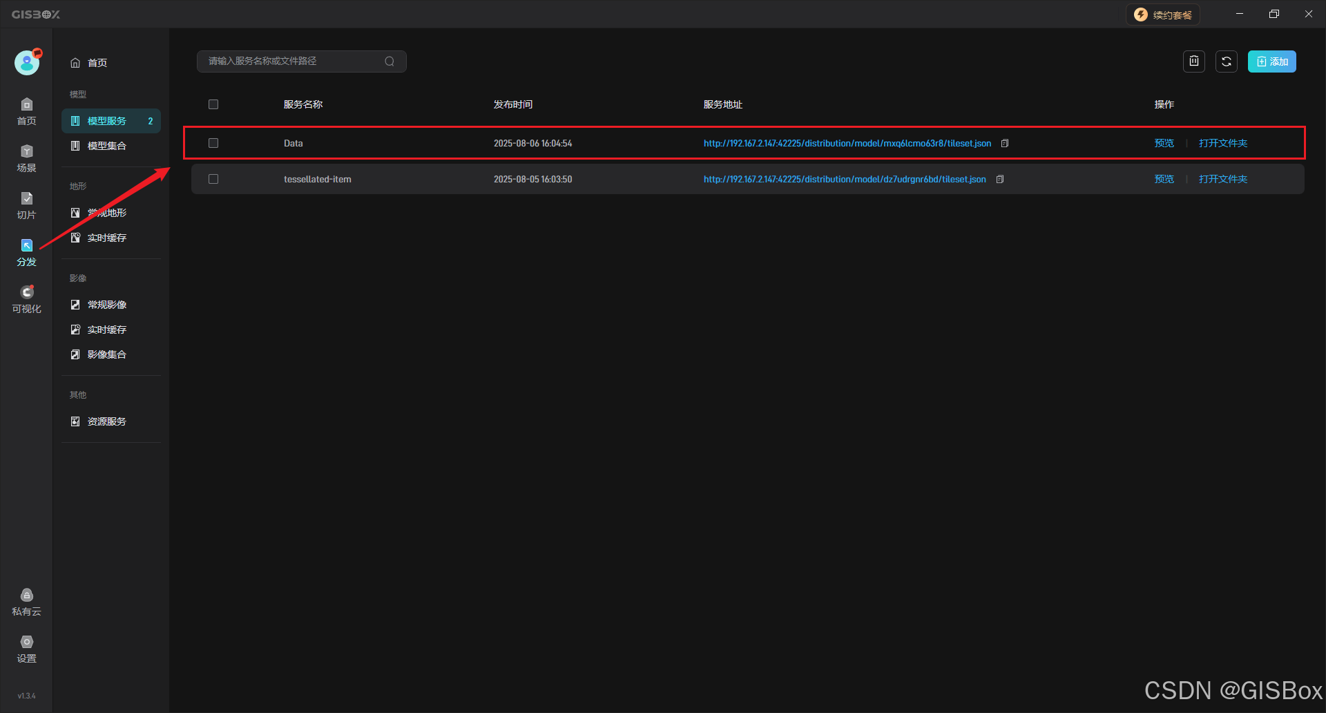 7、一般我们默认开启“同时发布成服务”后,创建的切片任务会同时在“分发”中添加一个对应类型的“服务”。