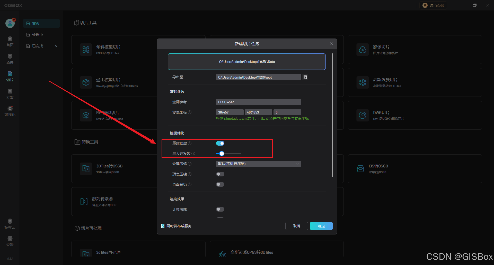 4、“重建顶层”默认关闭,当倾斜三维模型数据量较大时,可以选择开启,显著提升加载性能,增强浏览体验。开启“重建顶层”后会同时出现“最大并发数”,该设置项不建议修改,但如果转换失败可以将该项减少一半重新转换。