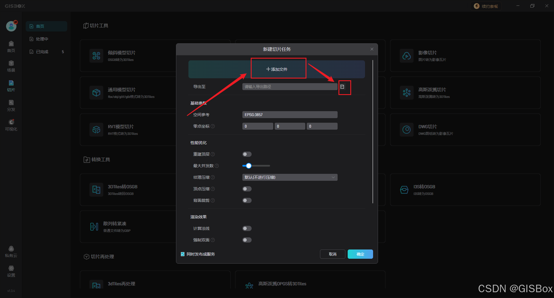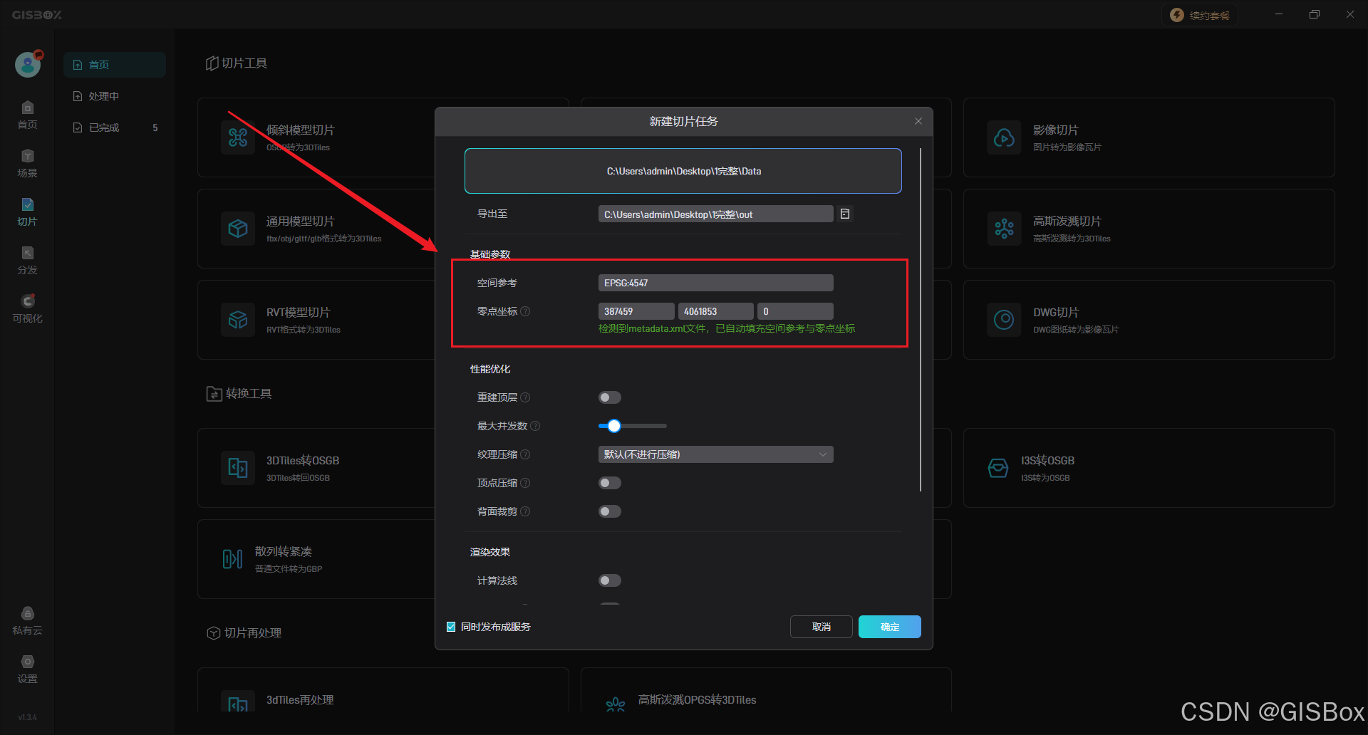 3、添加OSGB文件后,可在“基础参数”中设置切片导出文件夹,“空间参考”和“零点坐标”会根据文件夹中的“metadata.xml”文件自动生成。