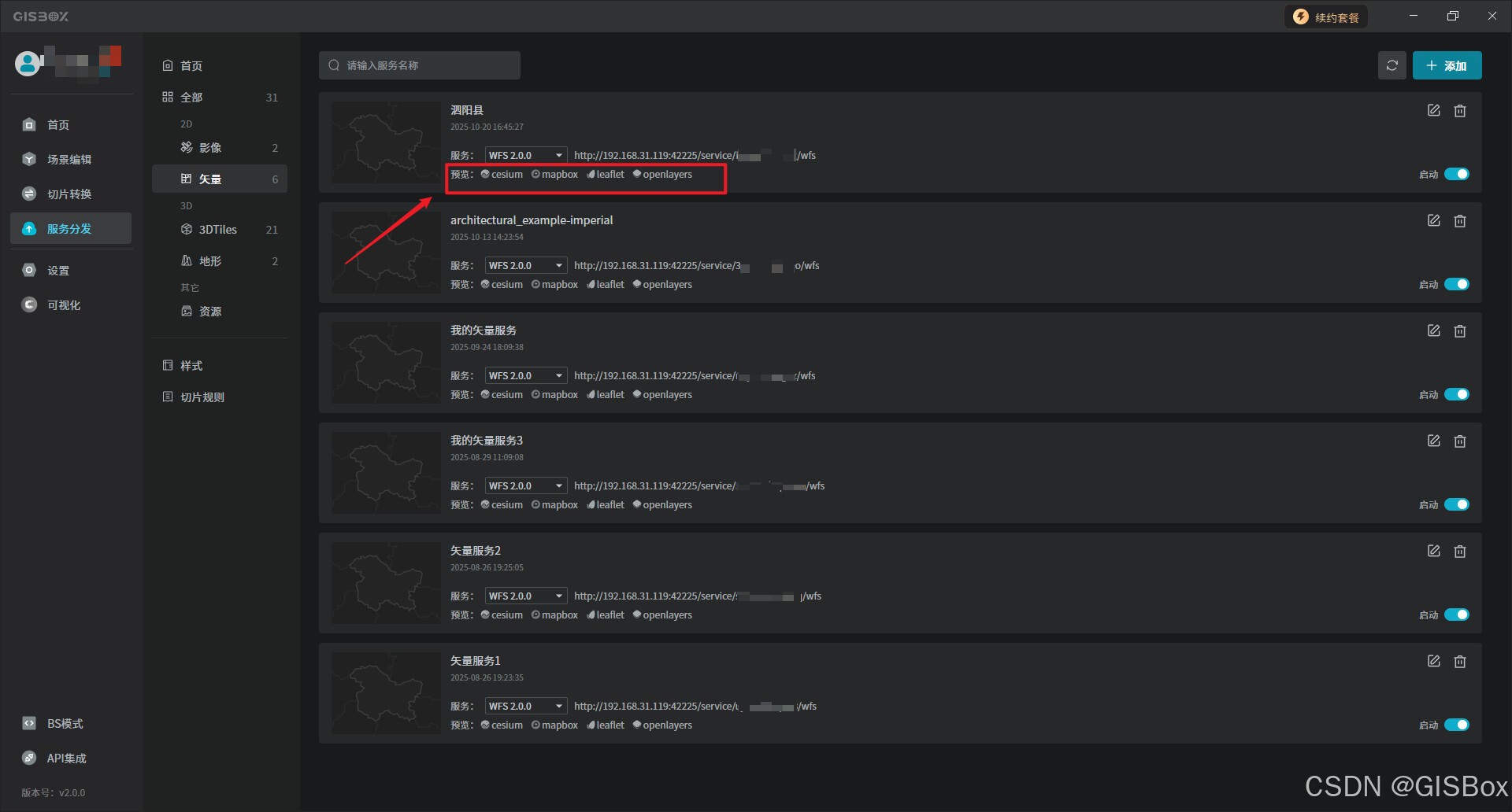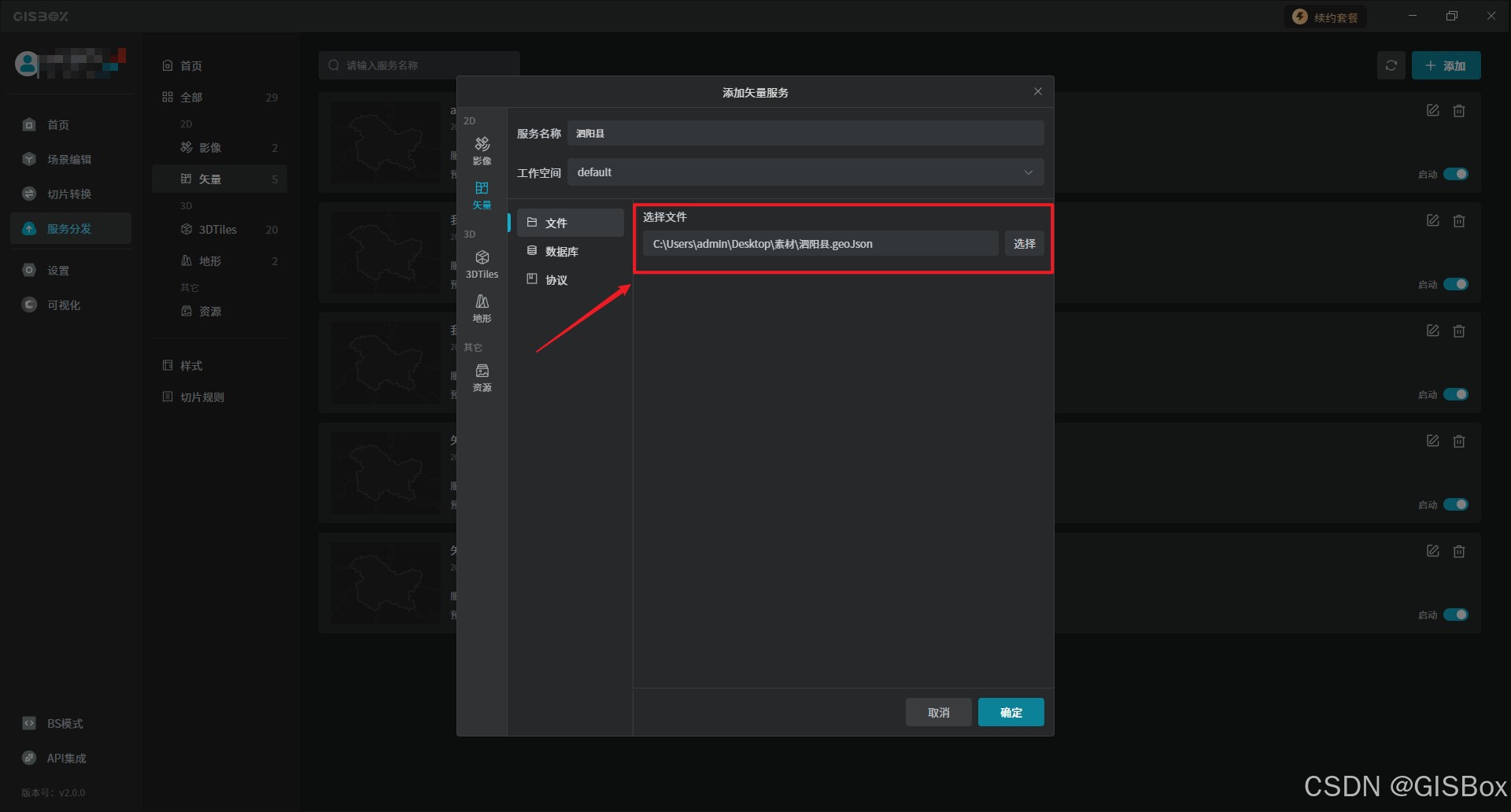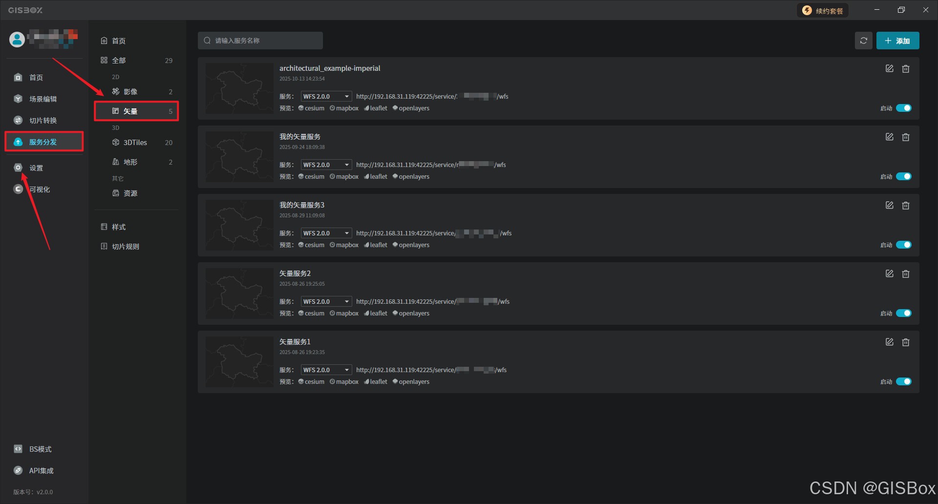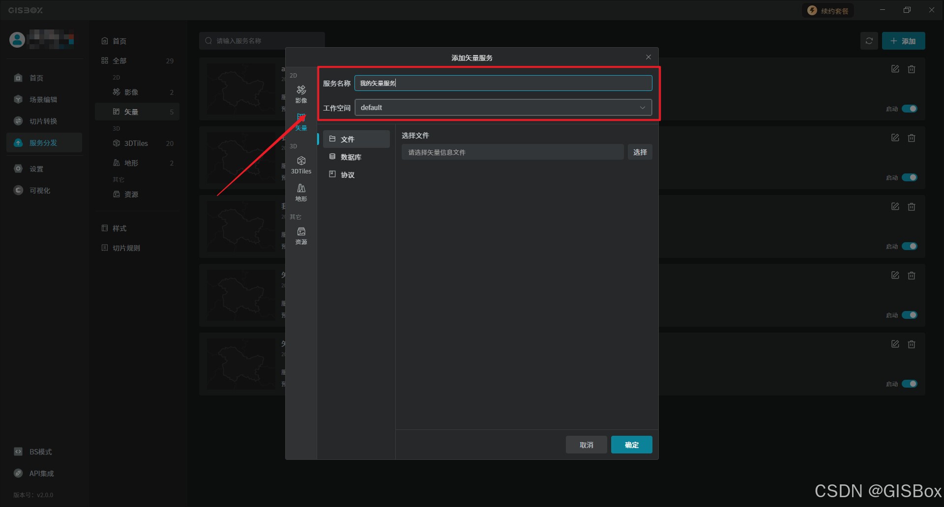 1、首先打开已经下载好的GISBox软件,点击“服务分发”,选择2D中的“矢量”服务。