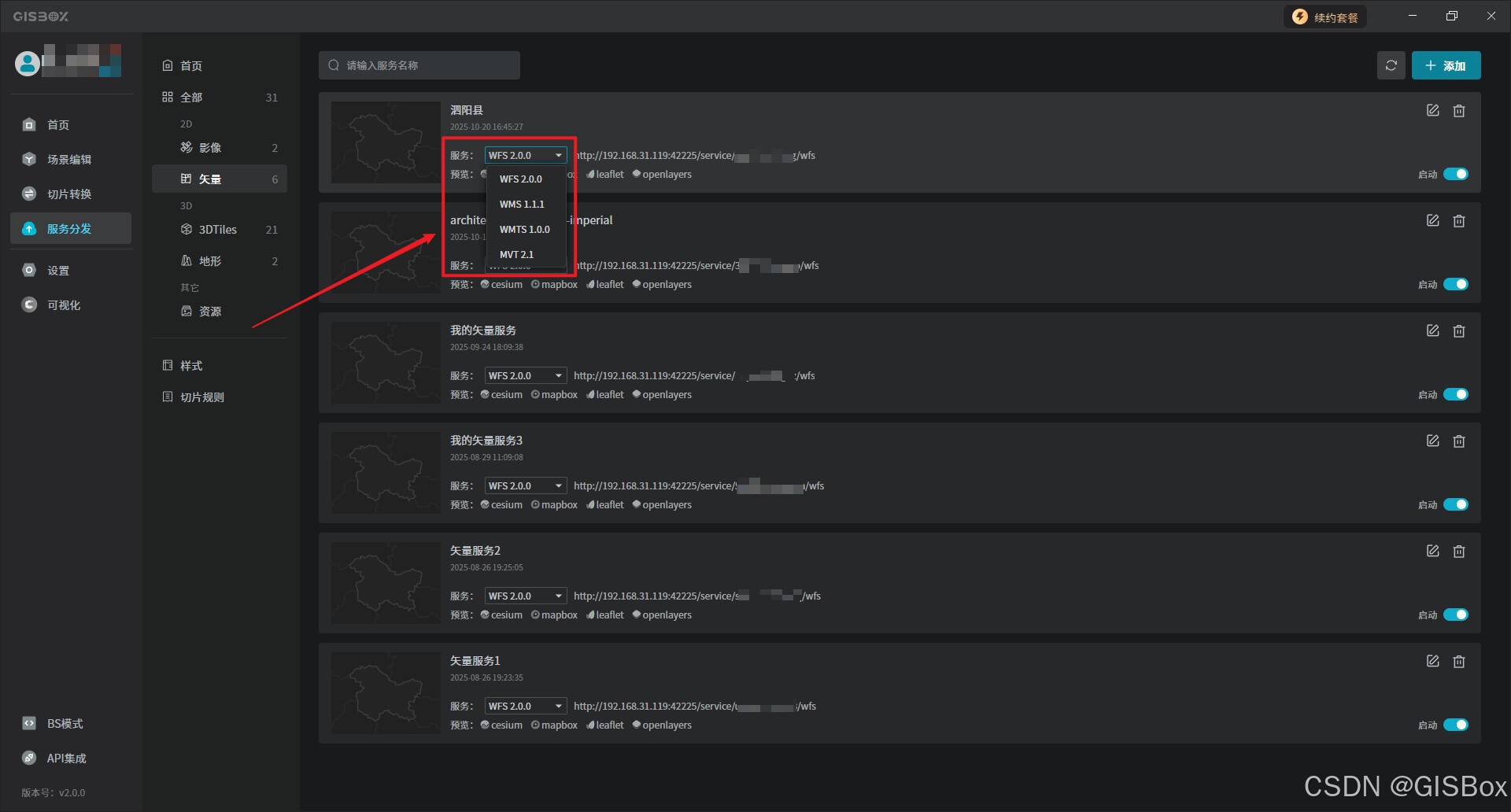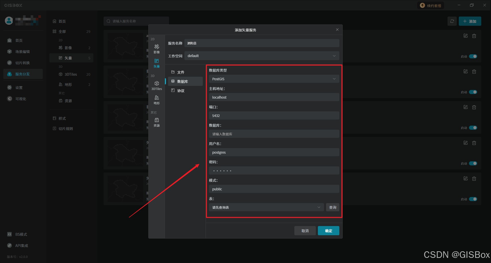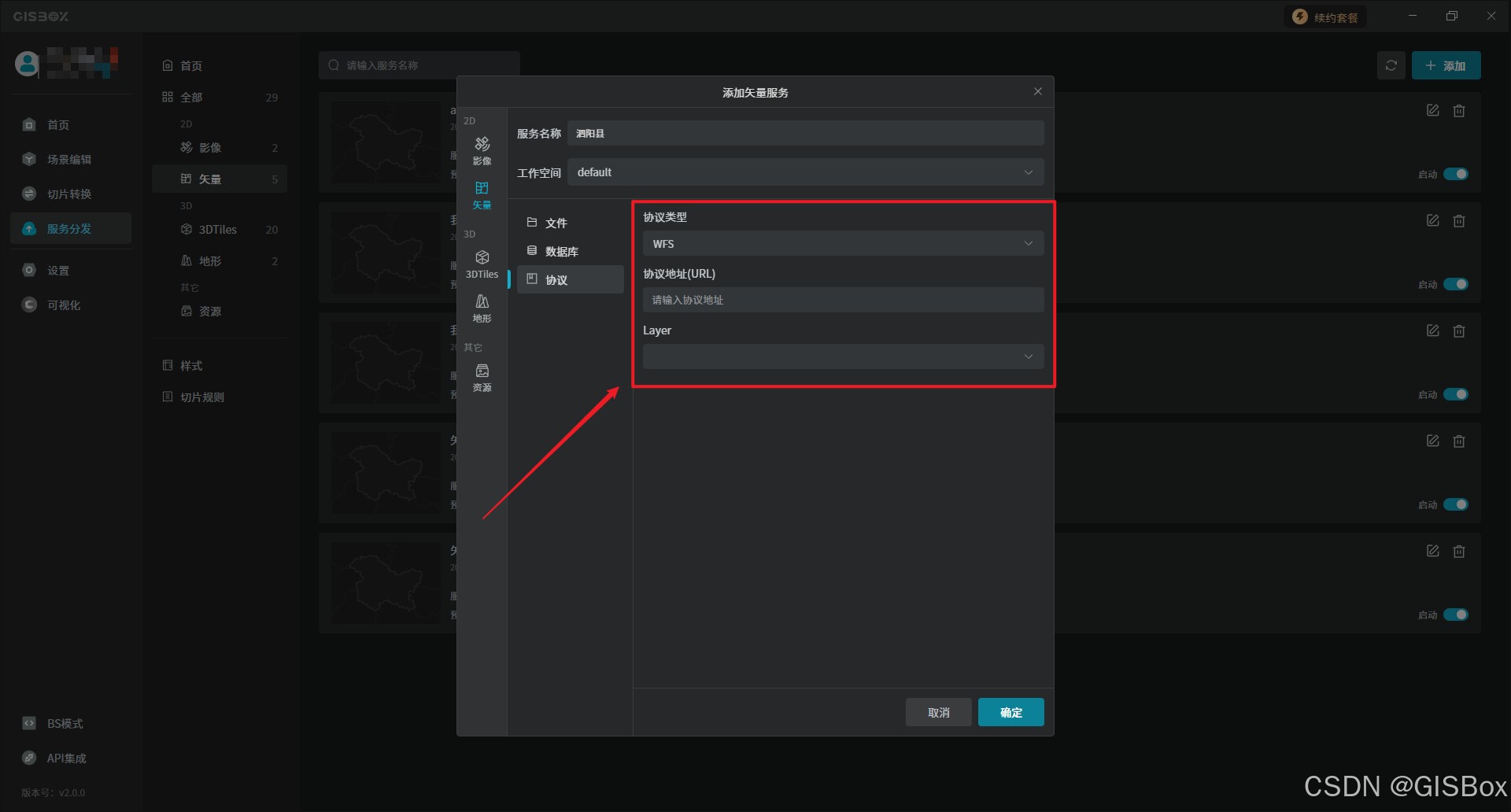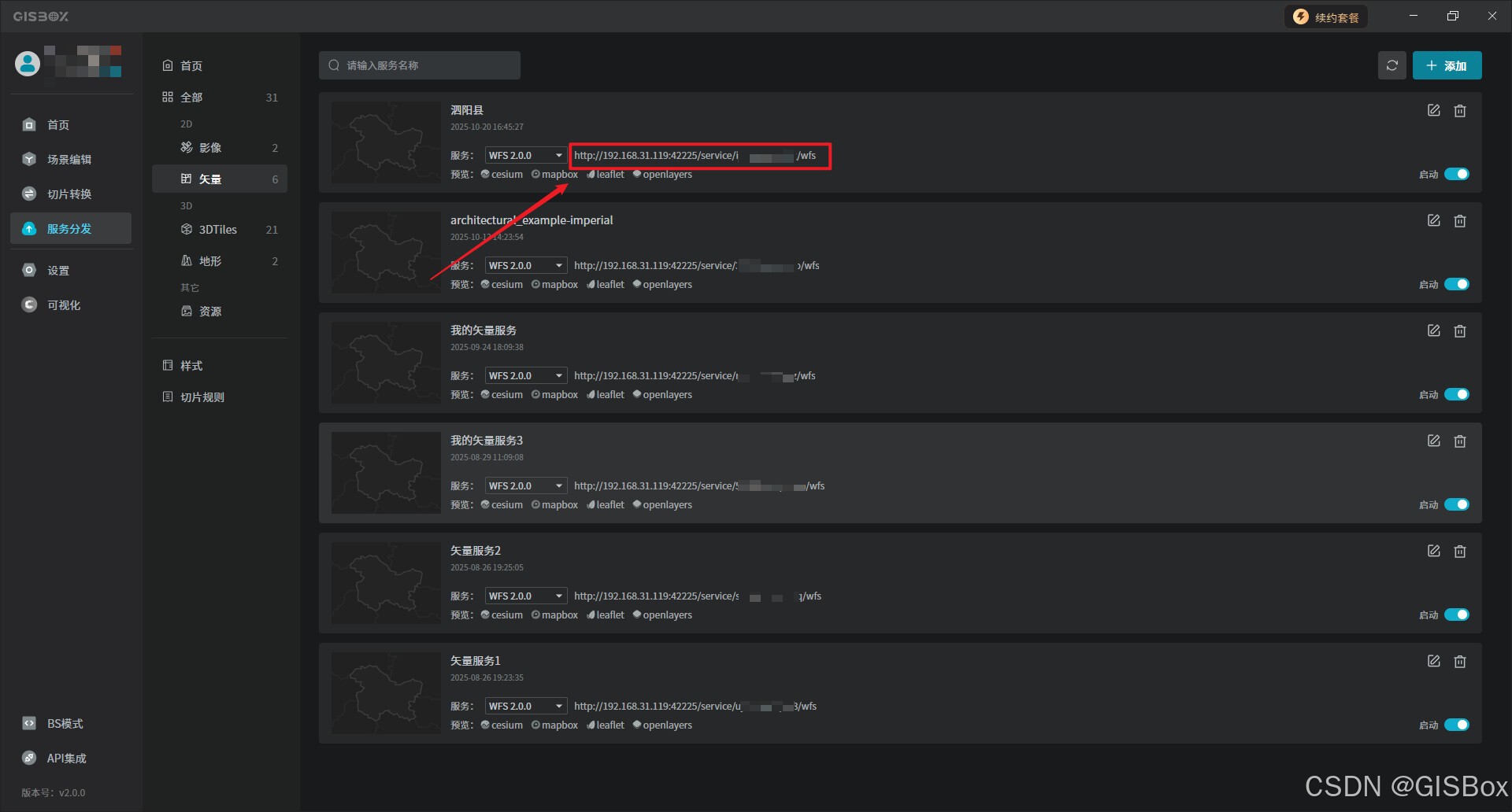 1、首先打开已经下载好的GISBox软件,点击“服务分发”,选择2D中的“矢量”服务。