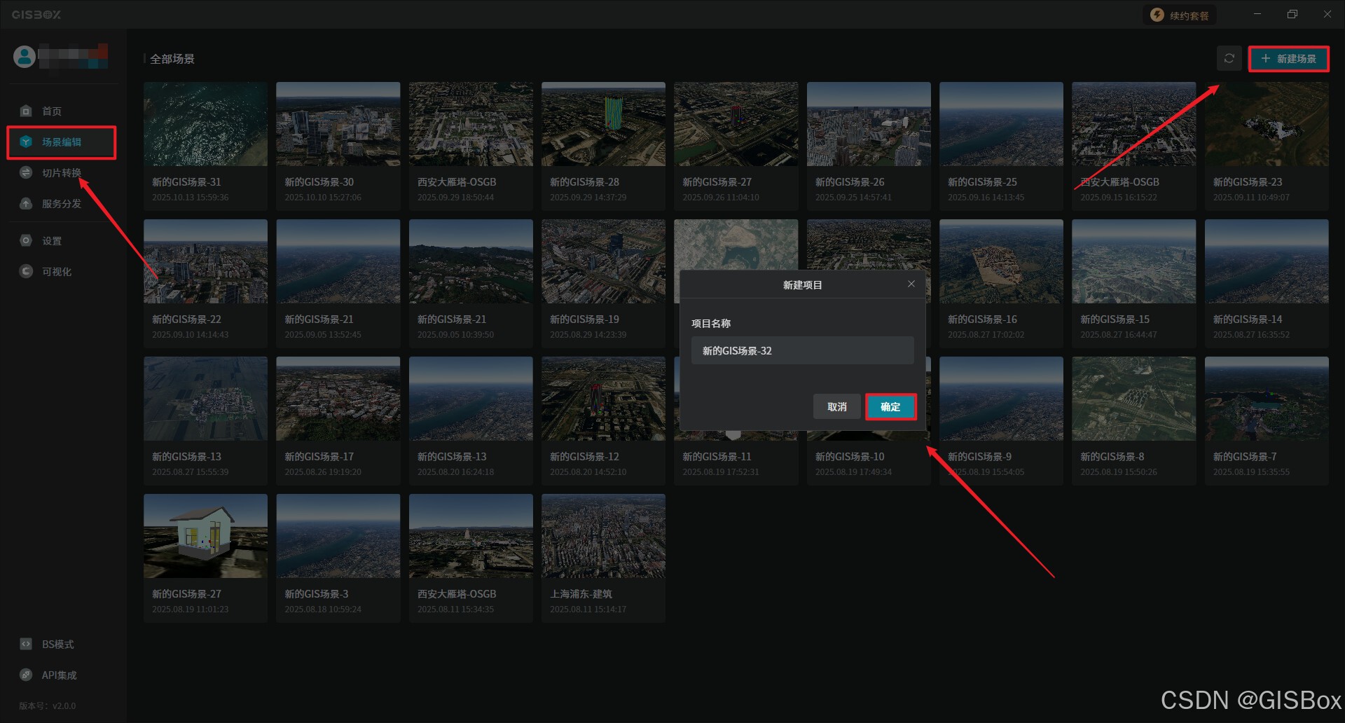 1、首先打开GISBox,点击“场景编辑”进行新建场景,输入项目名称后点击“确定”按钮。