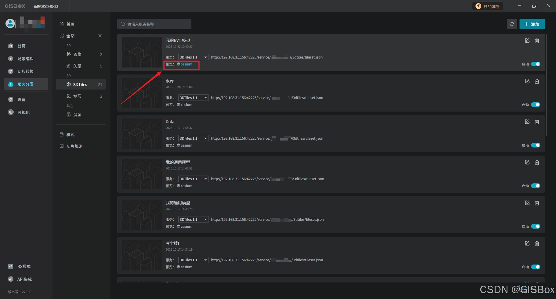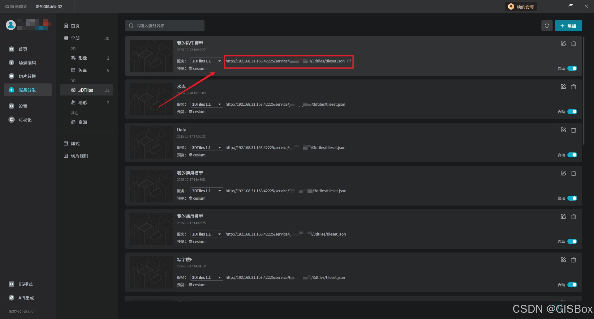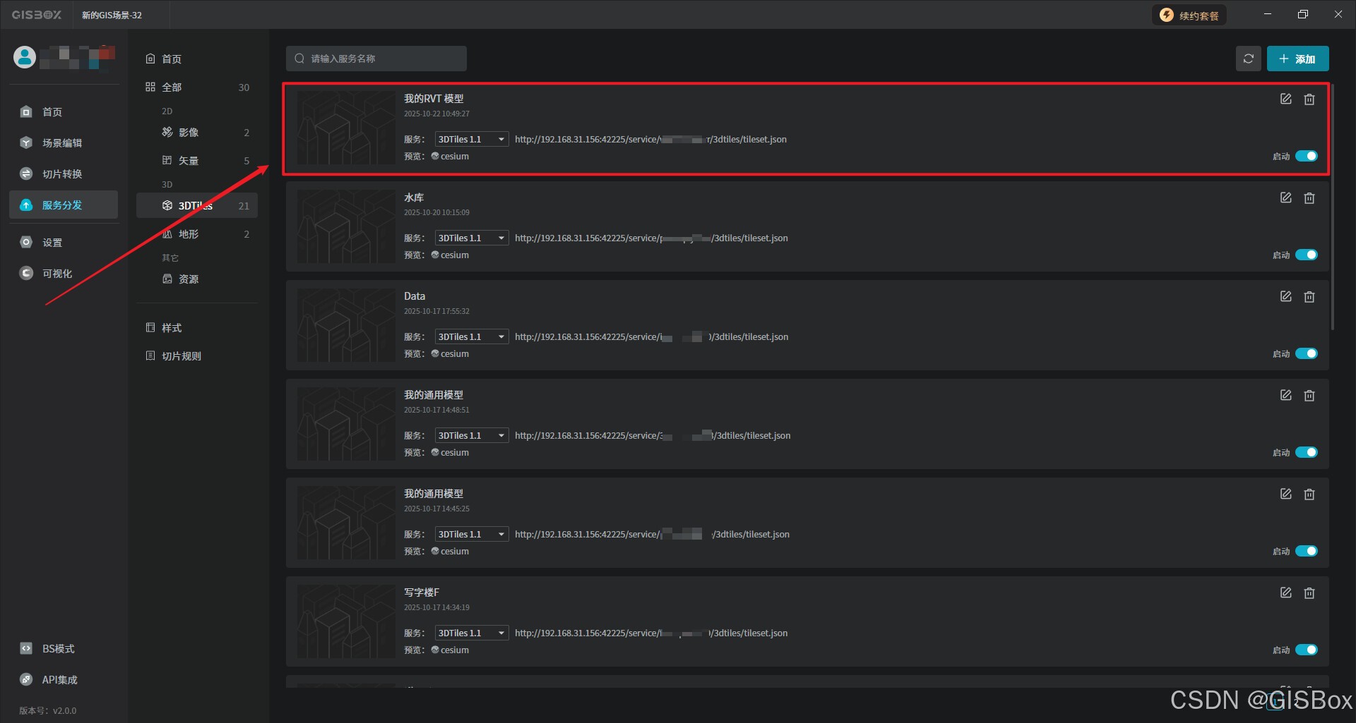 5、设置完成后,在“服务分发”的“3DTiles服务”中可以查看到刚添加的服务。