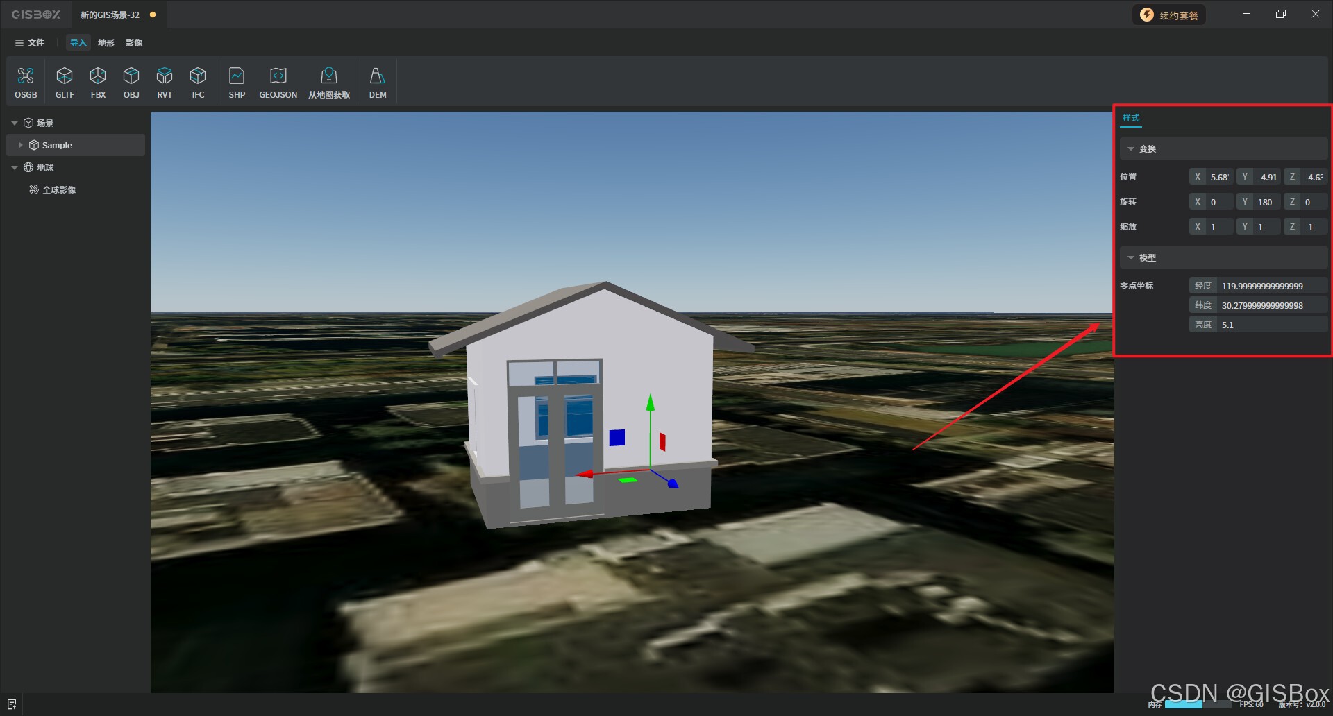 3、导入之后,场景中会出现你导入BIM数据模型,选择模型你可以在左侧对模型进行样式修改以及位置调整。