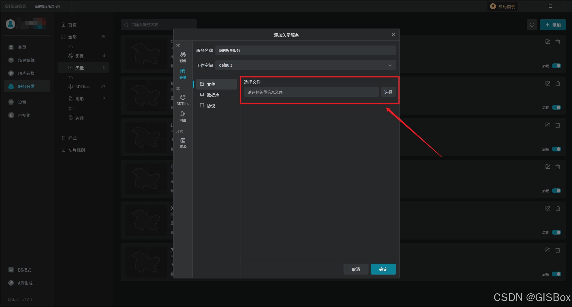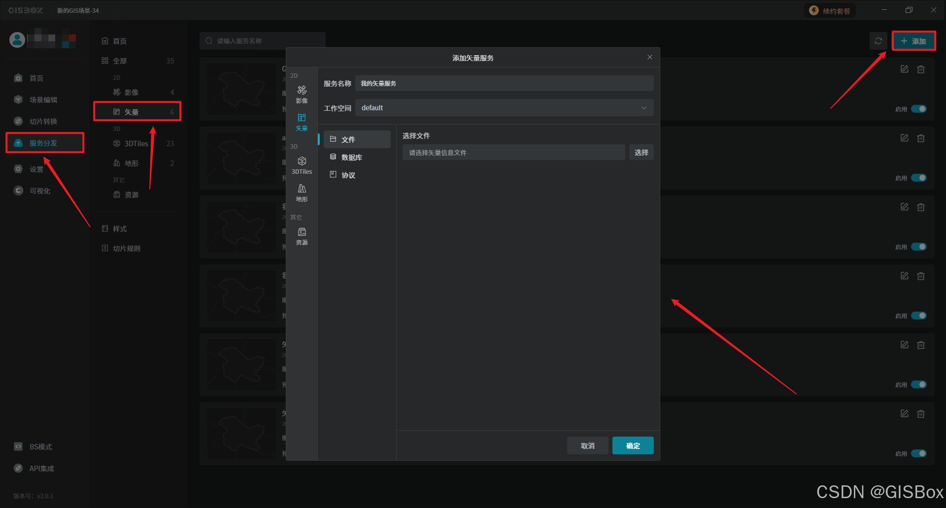 1、首先打开“GISBox”软件,选中“服务分发”,点击“矢量服务”中的“添加”按钮,进行矢量服务添加。