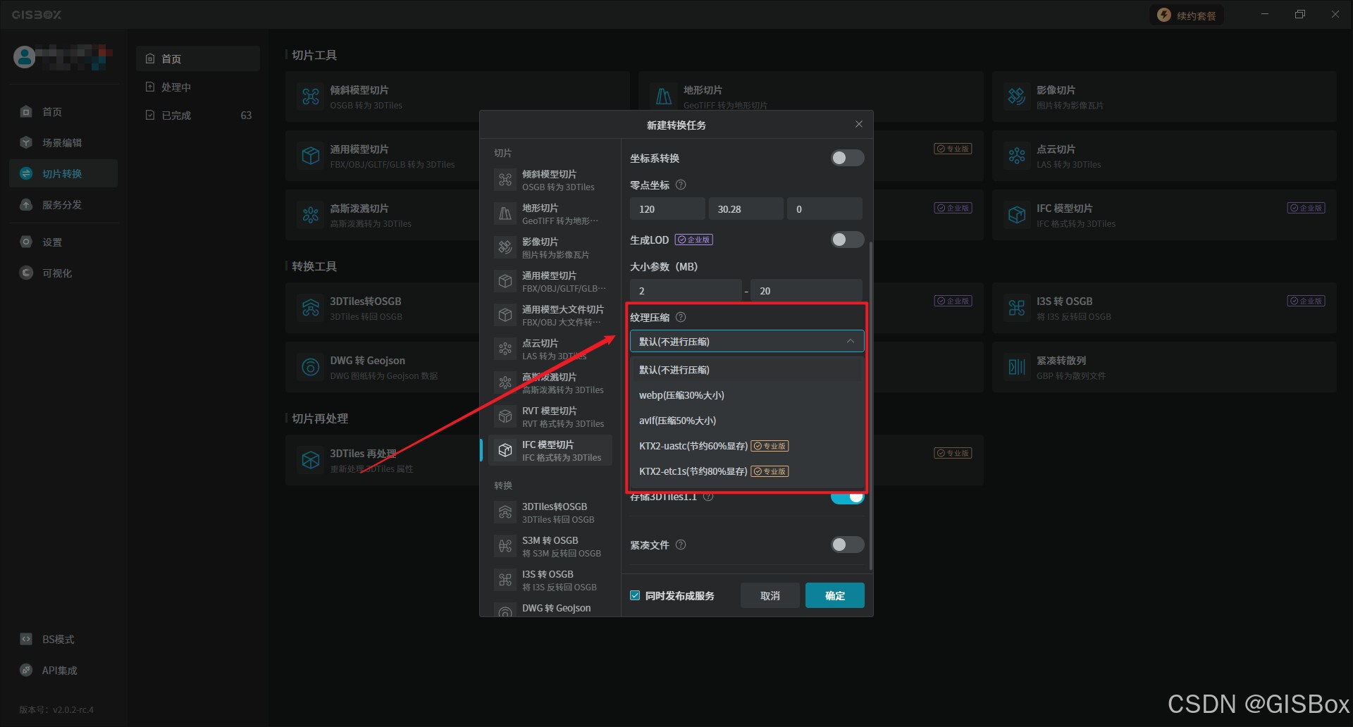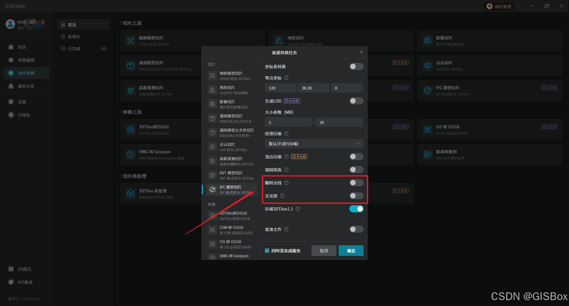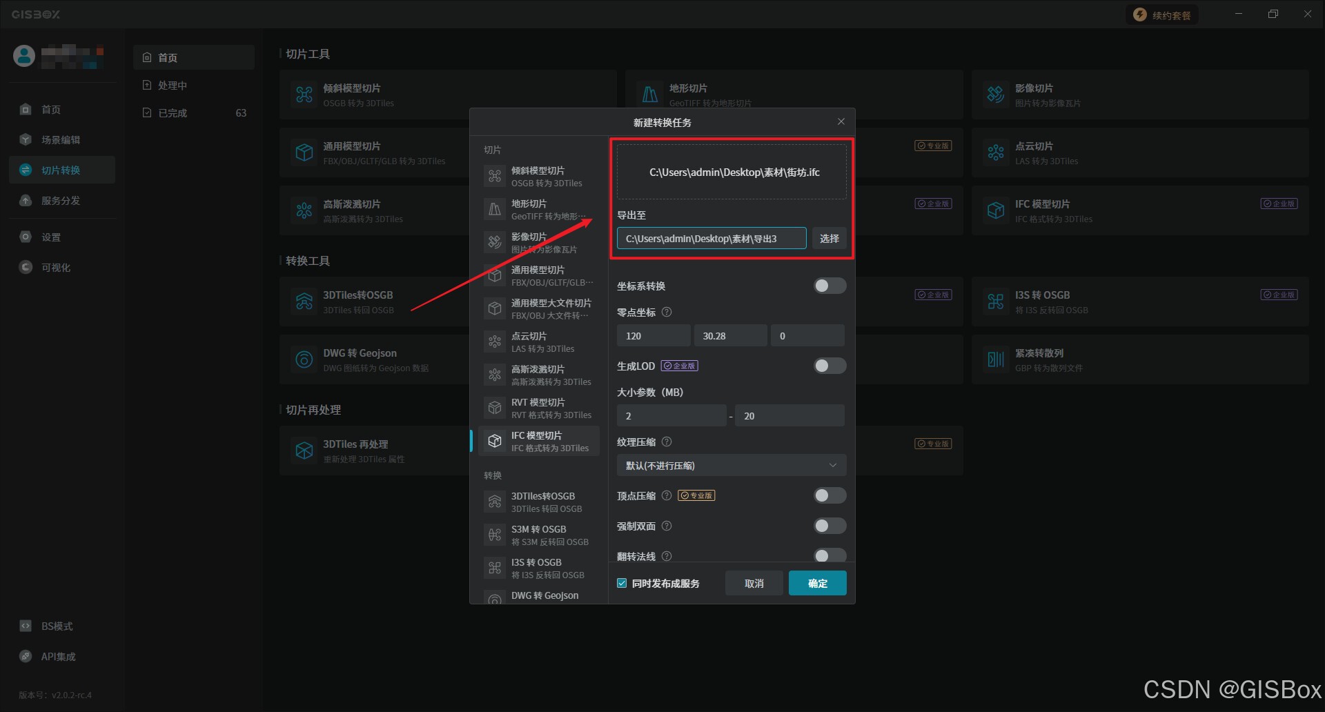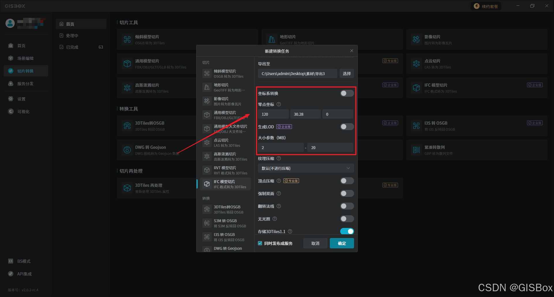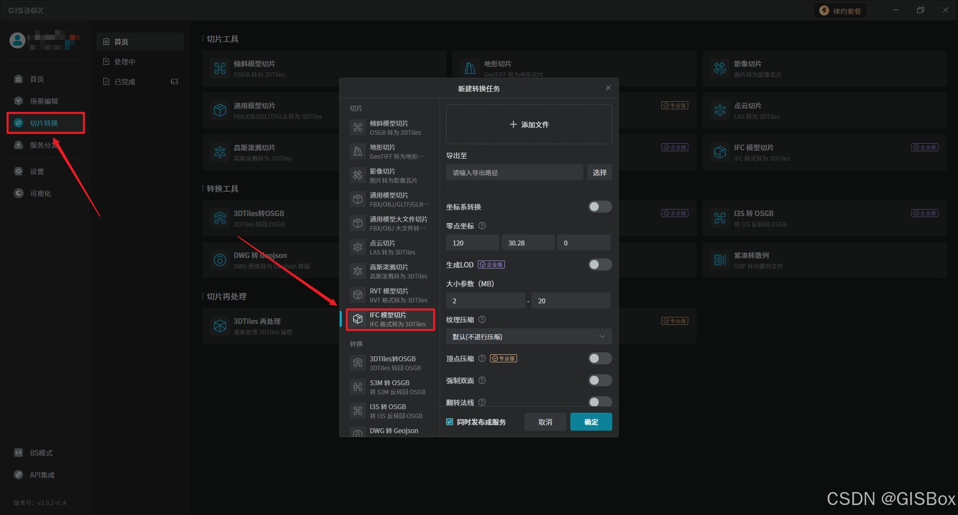 1、打开“GISBox”,在切片转换中选择“IFC转3DTiles”,并进行新建转换任务设置。