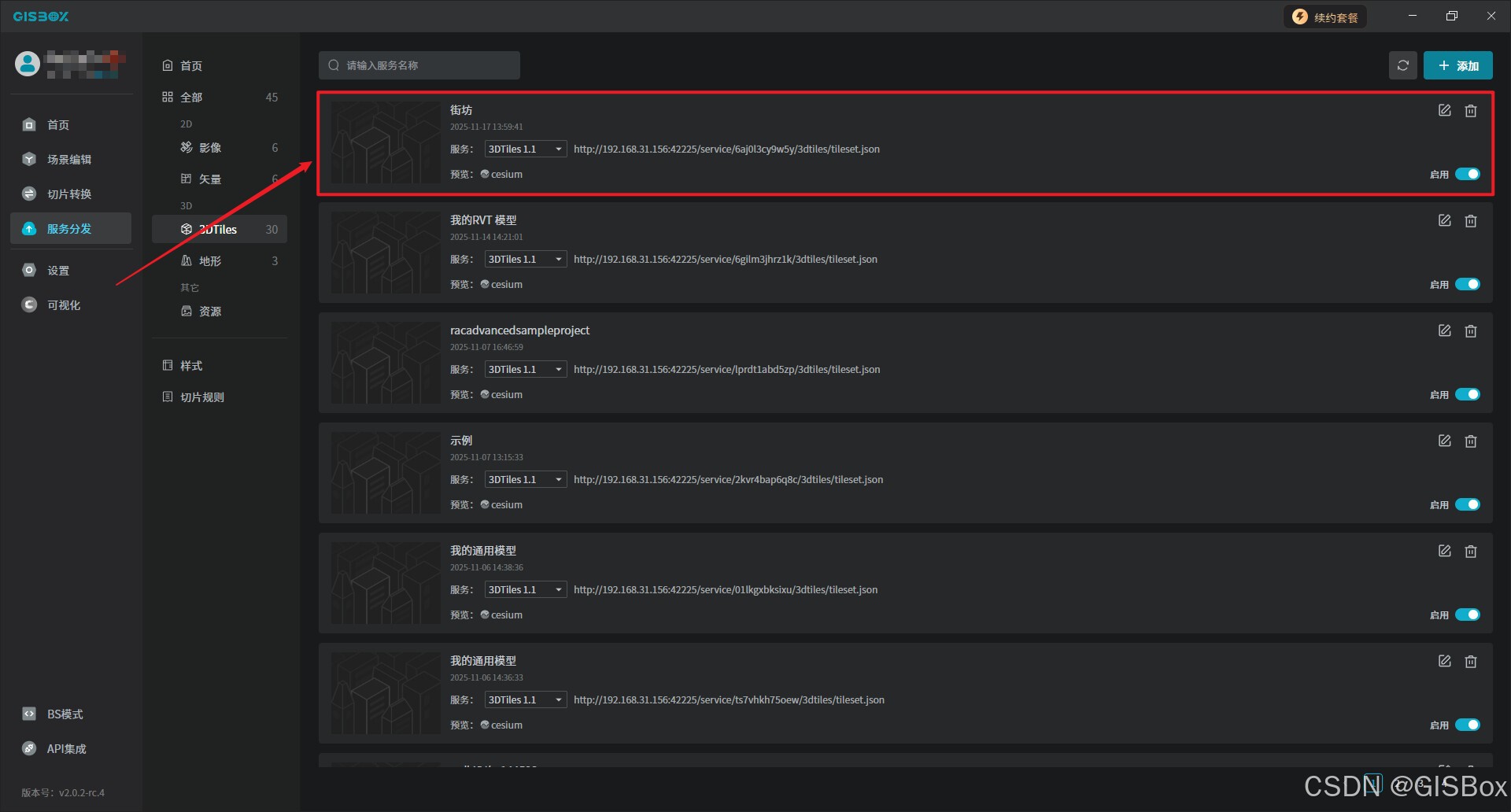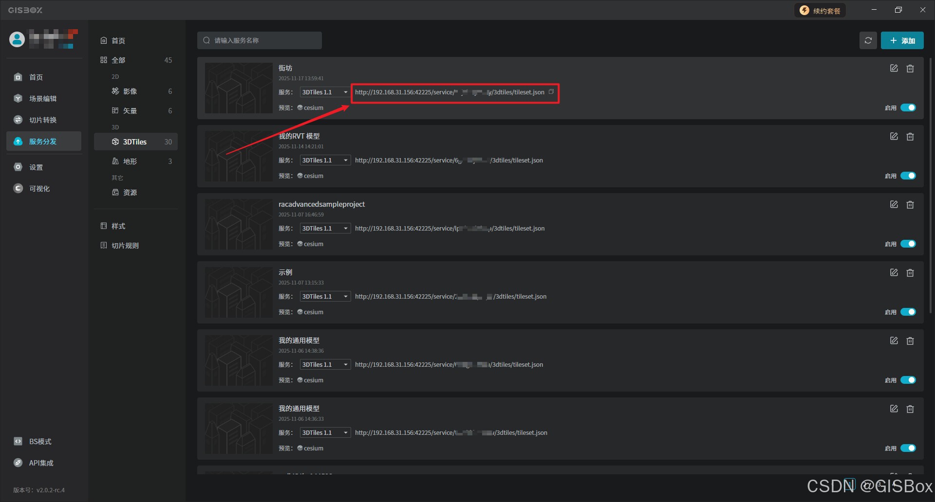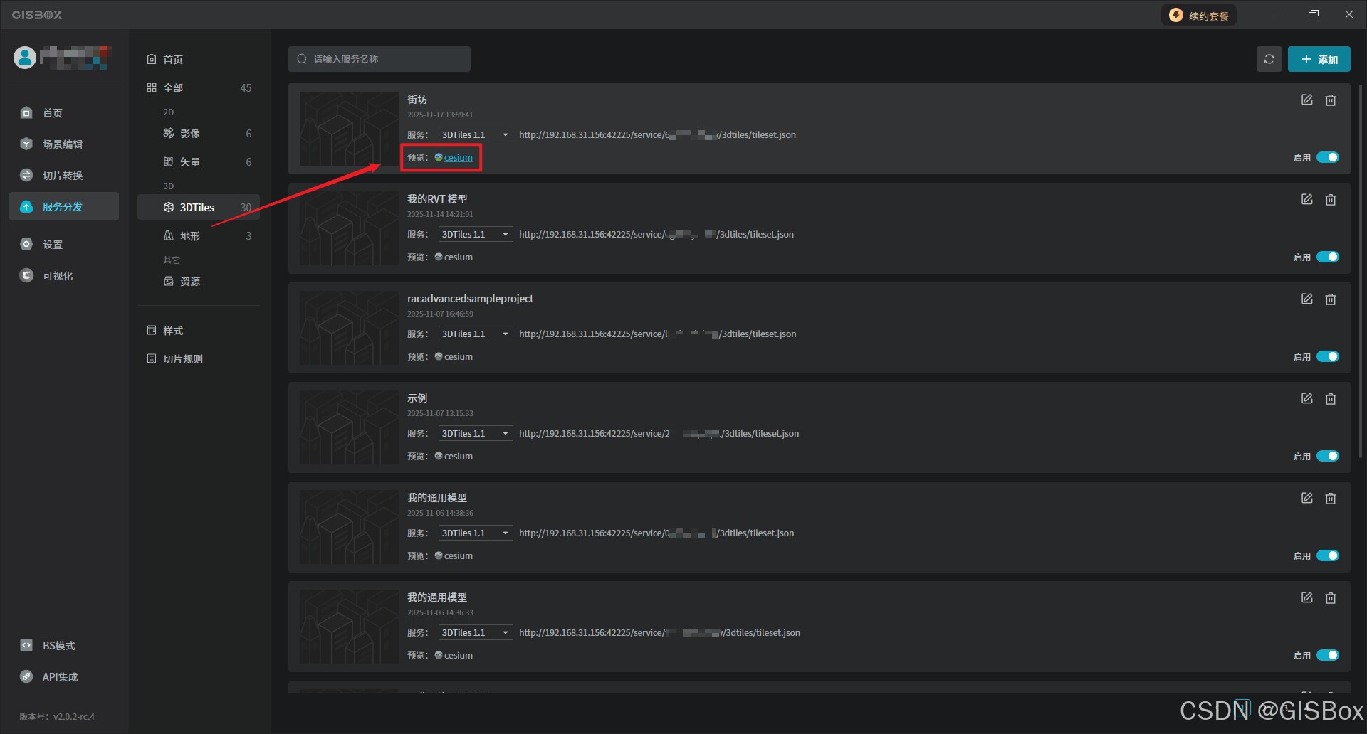 3、免费GIS服务器:内置强大GIS Server,转换后直接以3DTiles格式发布服务,生成的服务地址可以应用到cesium或数字孪生项目中。