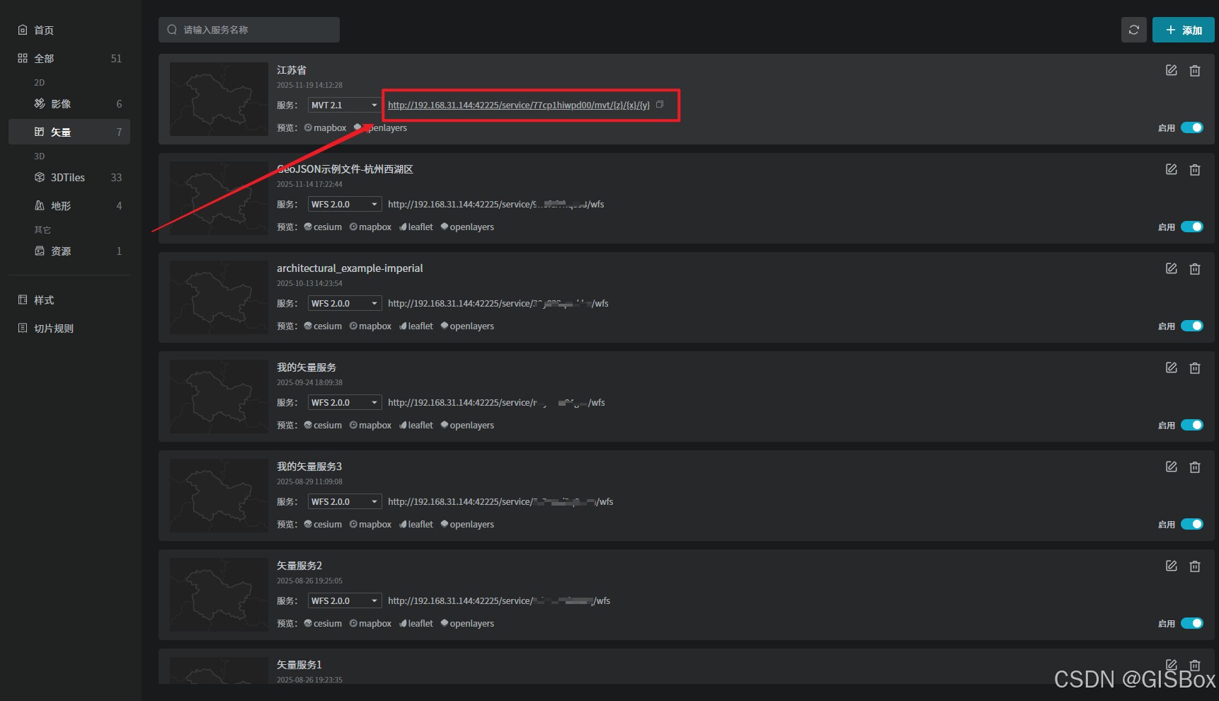 3、服务地址灵活应用:每发布一条服务就会生成一个服务地址,生成的服务地址可以运用到其他GIS平台或者数字孪生那个项目中,提高了GIS项目的效率。
