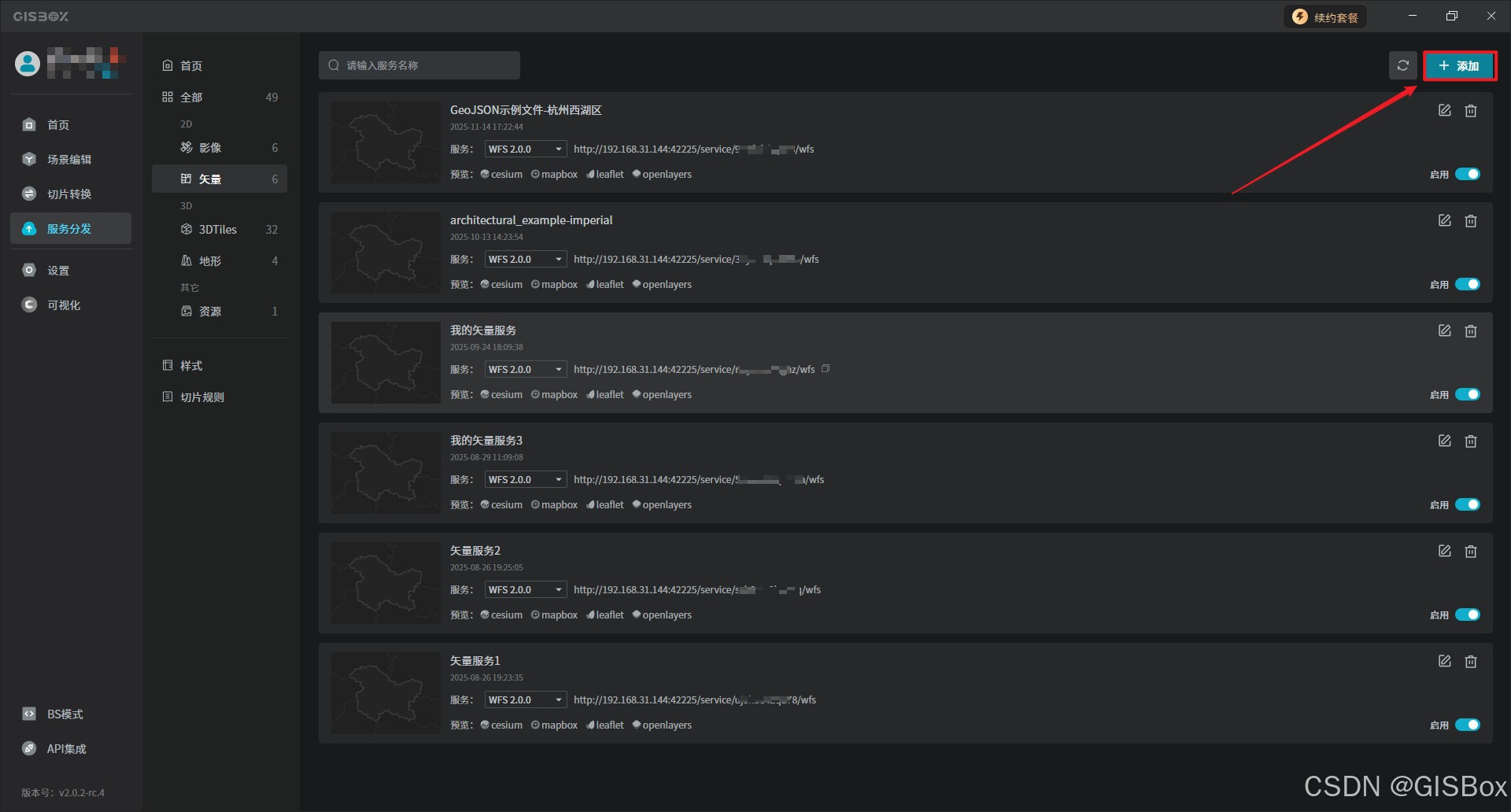 1、打开“GISBox”软件,点击“服务分发”找到“矢量”,接着点击界面右上角的“添加”,开始添加矢量服务。