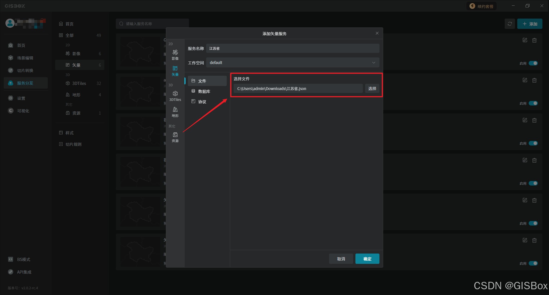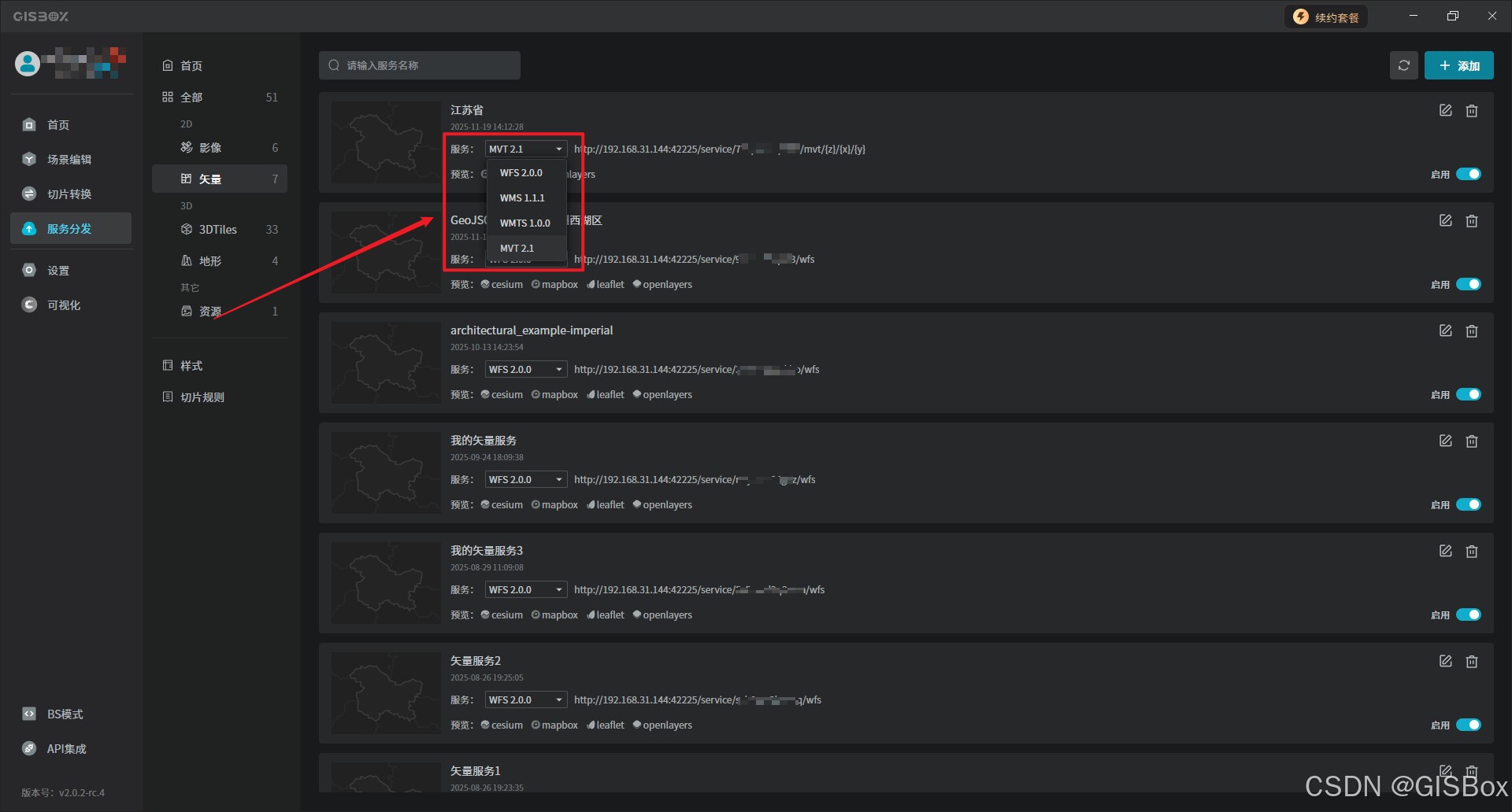 3、添加完成后,矢量服务列表中就会增加一条服务,点击服务中的下拉框按钮,选择MVT协议,这样导入的GeoJSON数据就会以MVT协议形式发布。