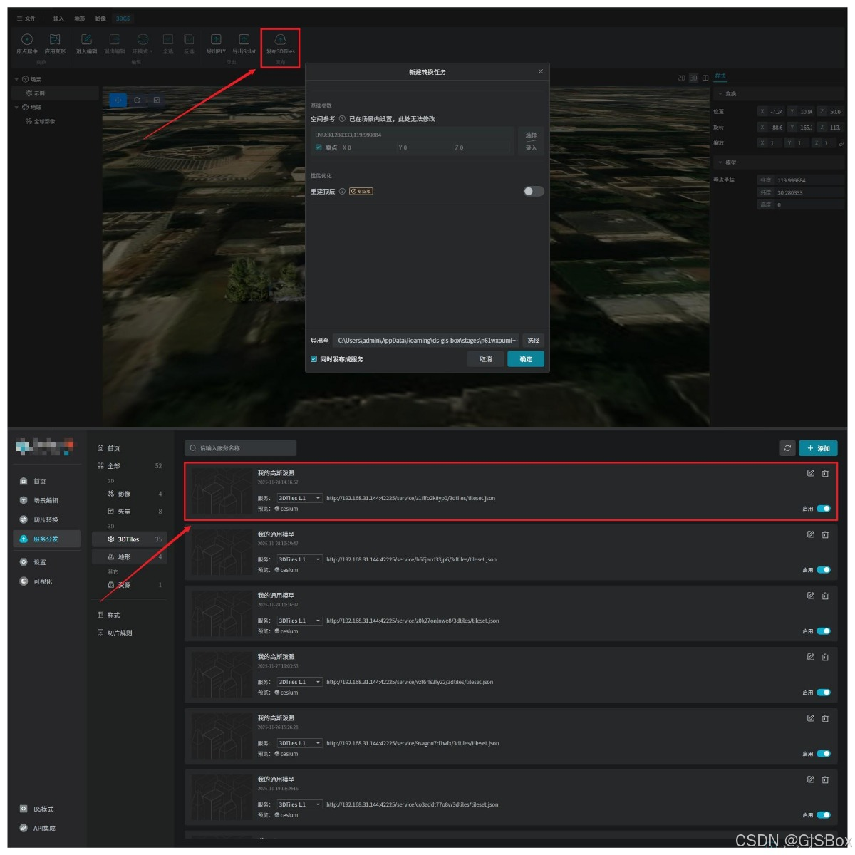 6、模型处理完成后,点击“发布3DTiles”,可一键将编辑好的高斯文件发布成3DTiles格式。