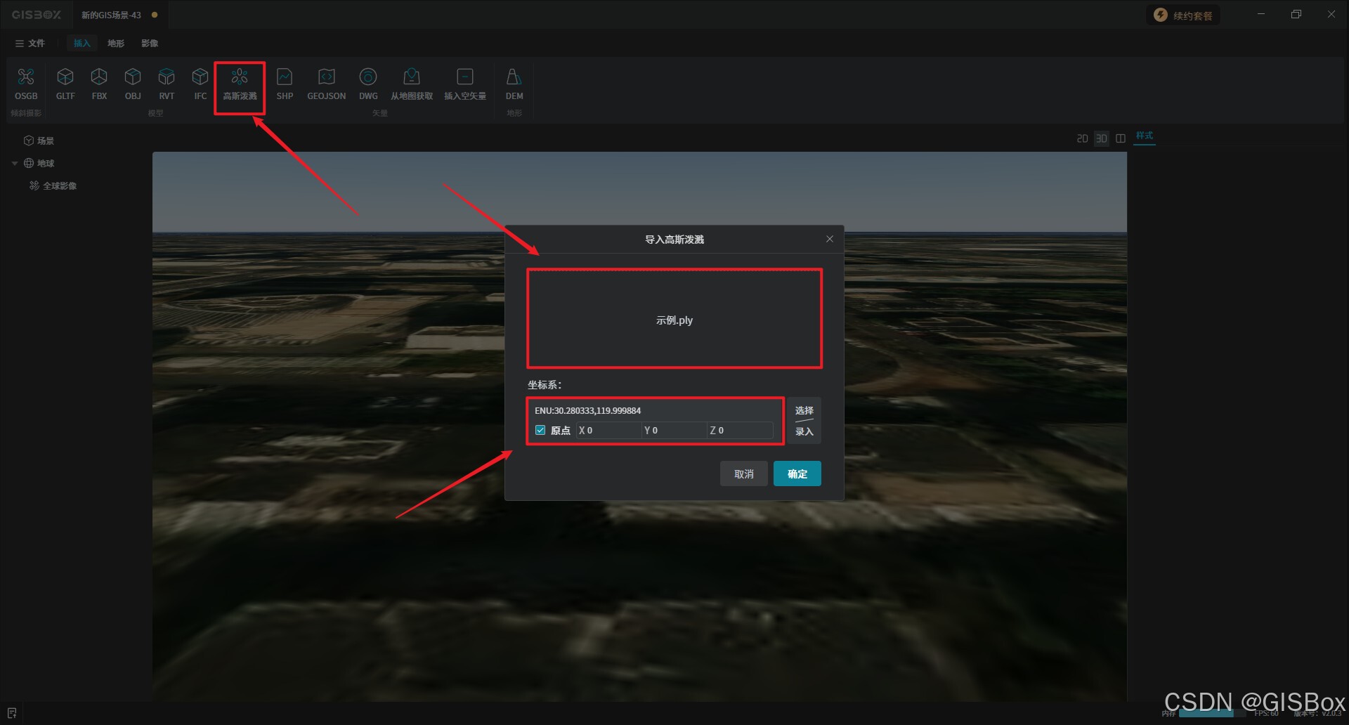 2、在场景中点击“高斯泼溅”,将高斯泼溅的格式文件导入,GISBox支持常见的.splat、.ply和.spz格式。如果模型有坐标系,可直接点击“选择”进行搜索,没有就保持默认ENU局部坐标系。