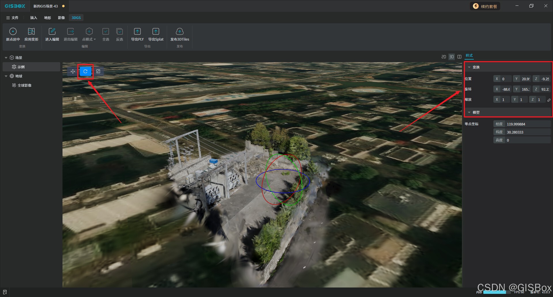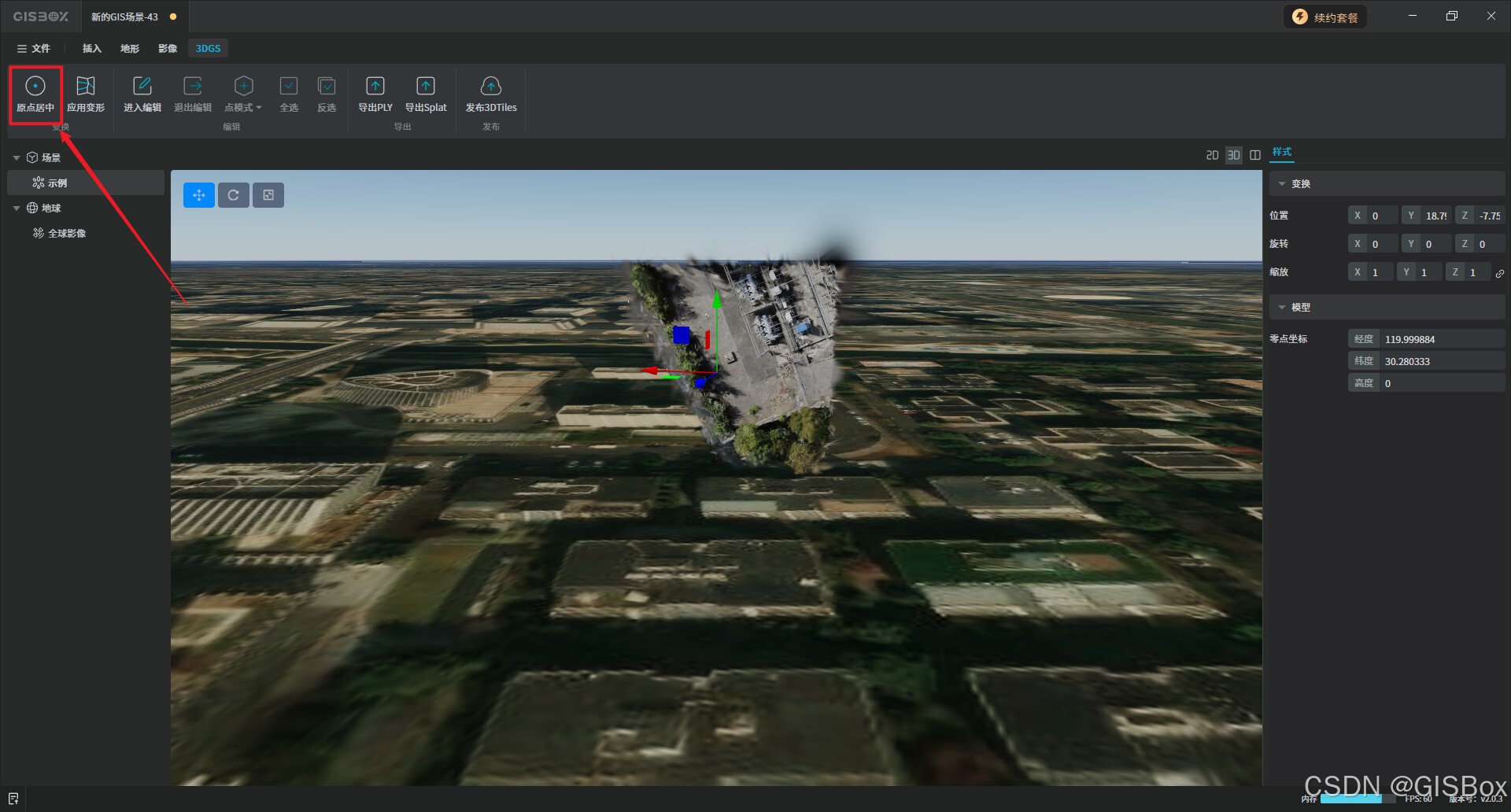 3、模型导入场景后,可能会出现模型方向翻转,或中心点偏远导致操作不便的问题。对于这一问题,用户只需点击“原点居中”按钮,将模型的旋转中心智能校准至其几何中心,并通过旋转模型来调整位置的角度。当然GISBox右侧的样式中也支持手动调整的。