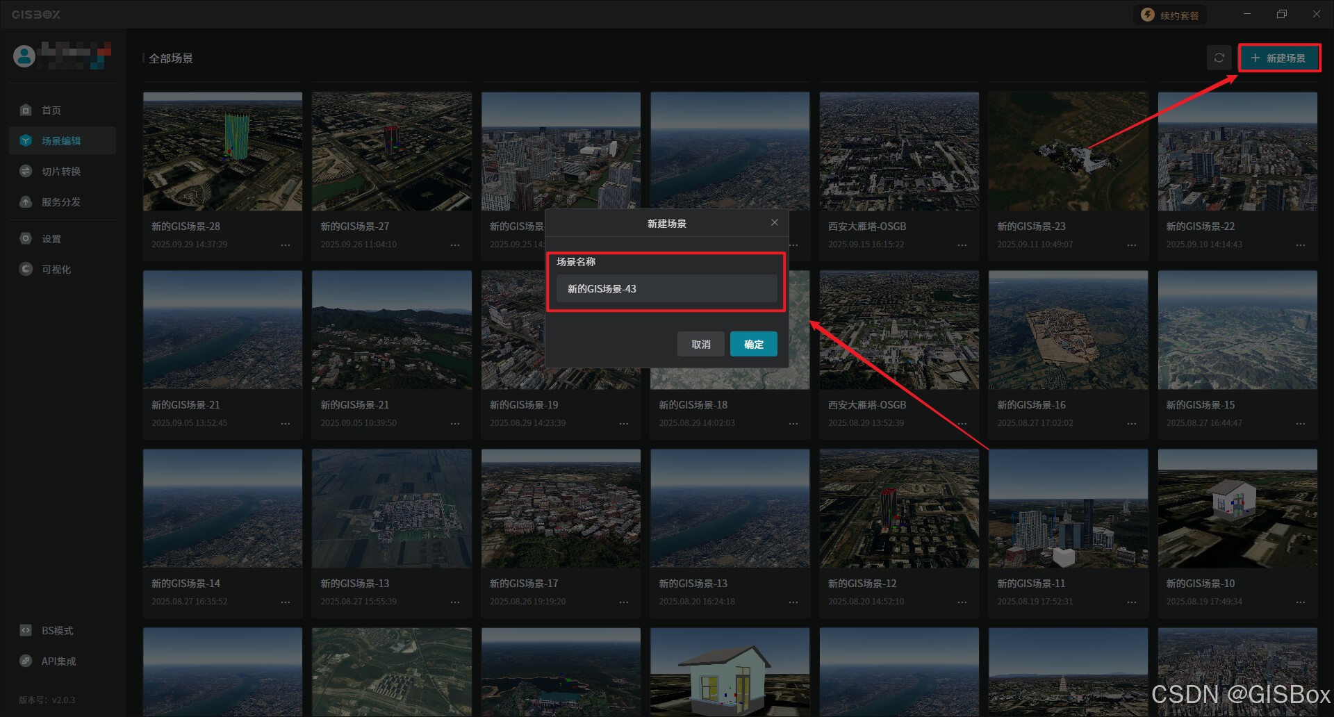 1、首先下载最新版本的GISBox软件,点击新建场景,输入场景名称。