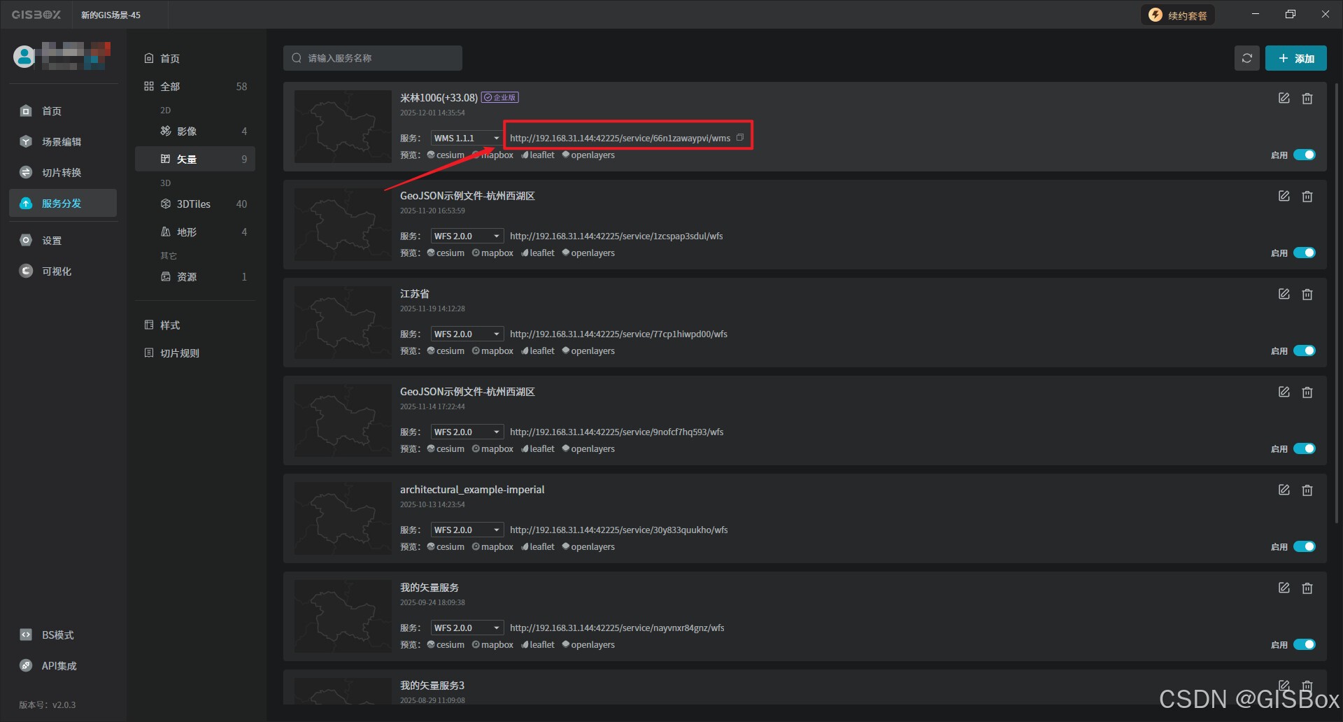 6、DWG格式文件会自动发布成矢量服务。点击“cesium”预览框架,一键预览。需注意的是,DWG的服务发布需要升级至企业版。