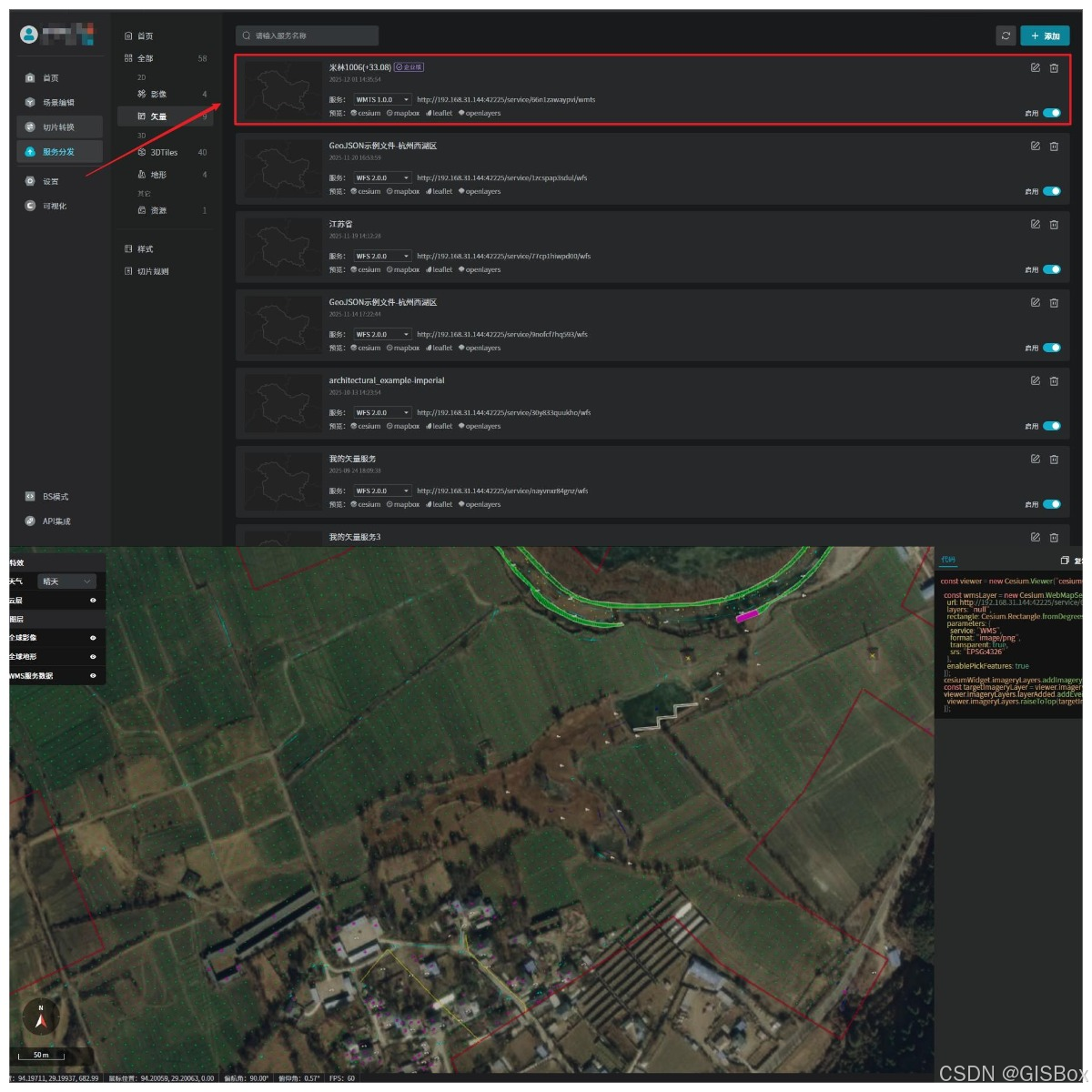 7、生成的服务地址可直接运用到cesium等GIS引擎或数字孪生项目中,如山海鲸可视化。