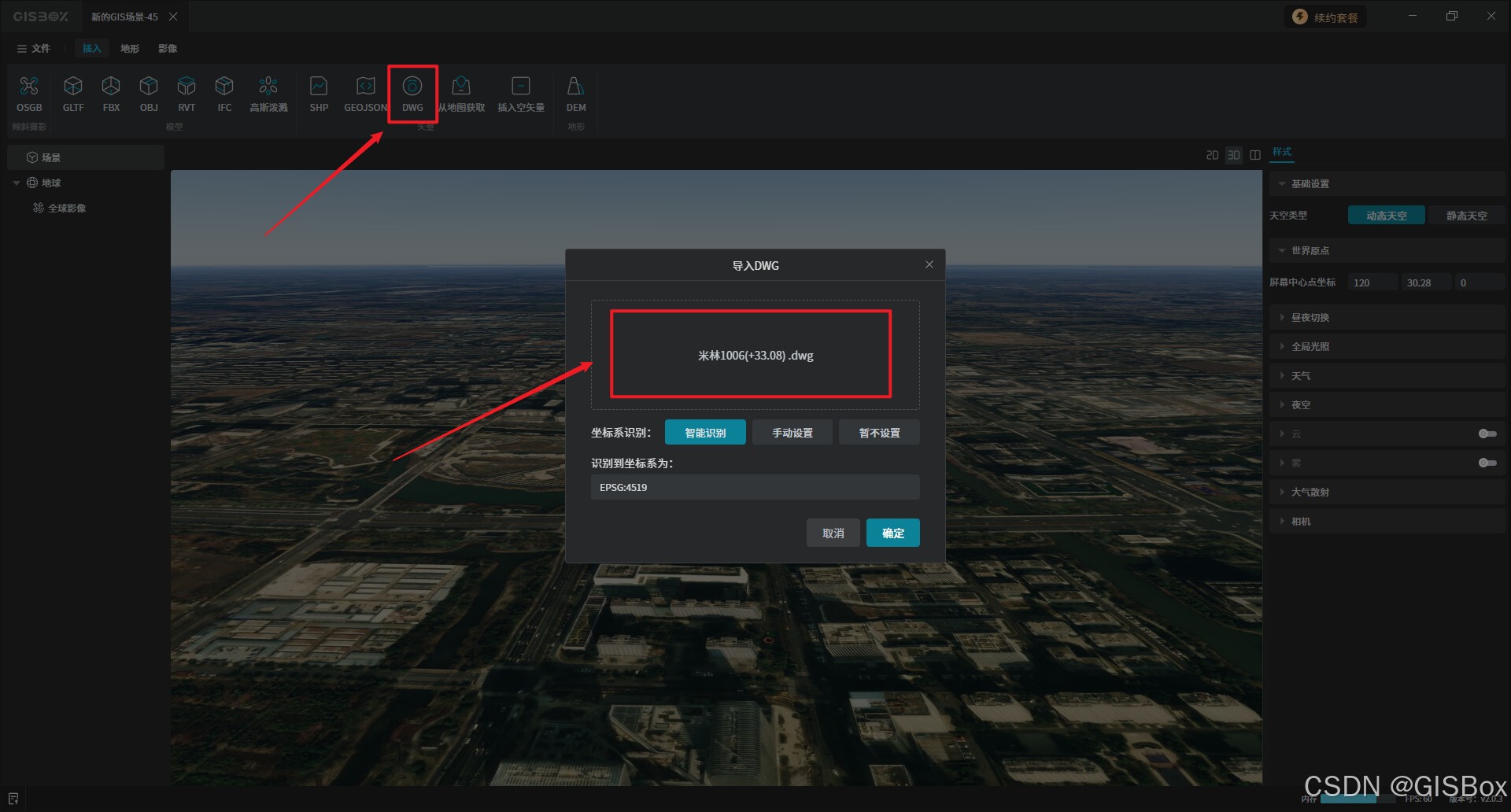 2、在场景中点击“DWG”按钮,将本地的.dwg格式文件添加进去,有坐标的DWG文件,软件会自动识别获取。未识别的可以手动获取,没有坐标的可以选择暂不设置。