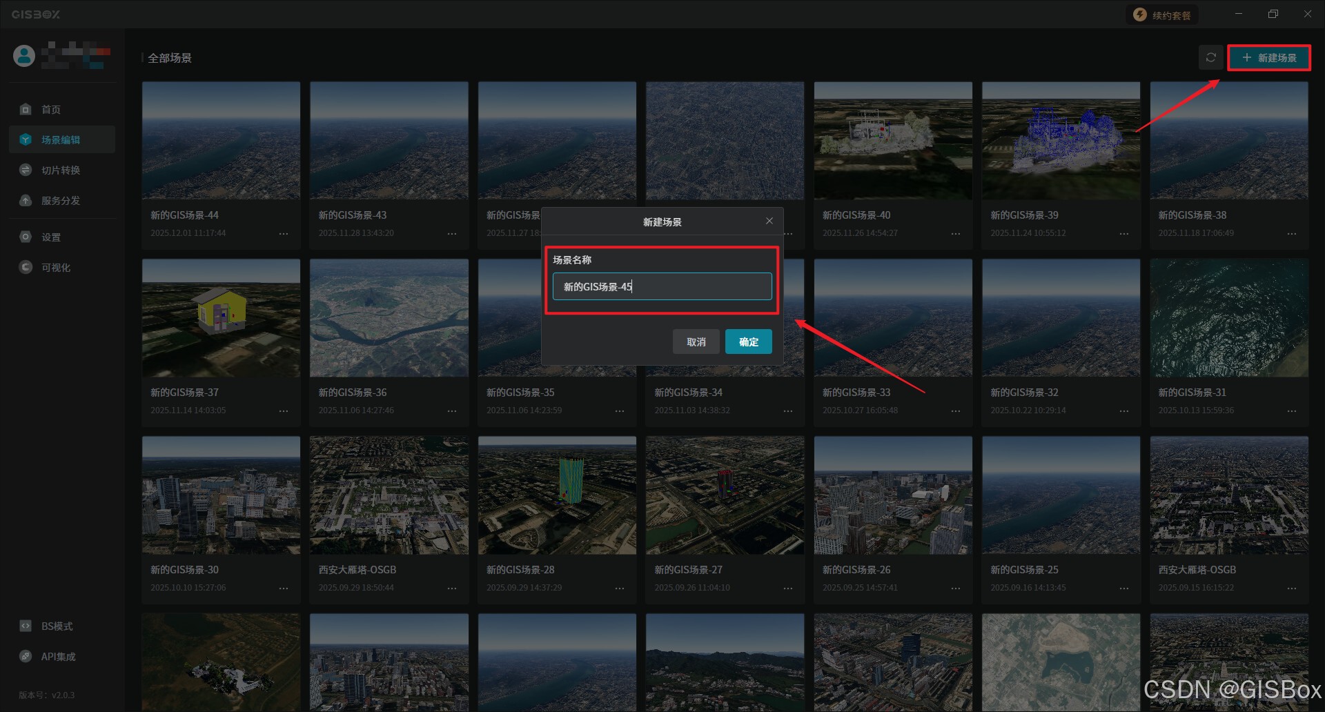 1、打开GISBox软件,点击“新建场景”,输入项目名称,项目名称自定义。