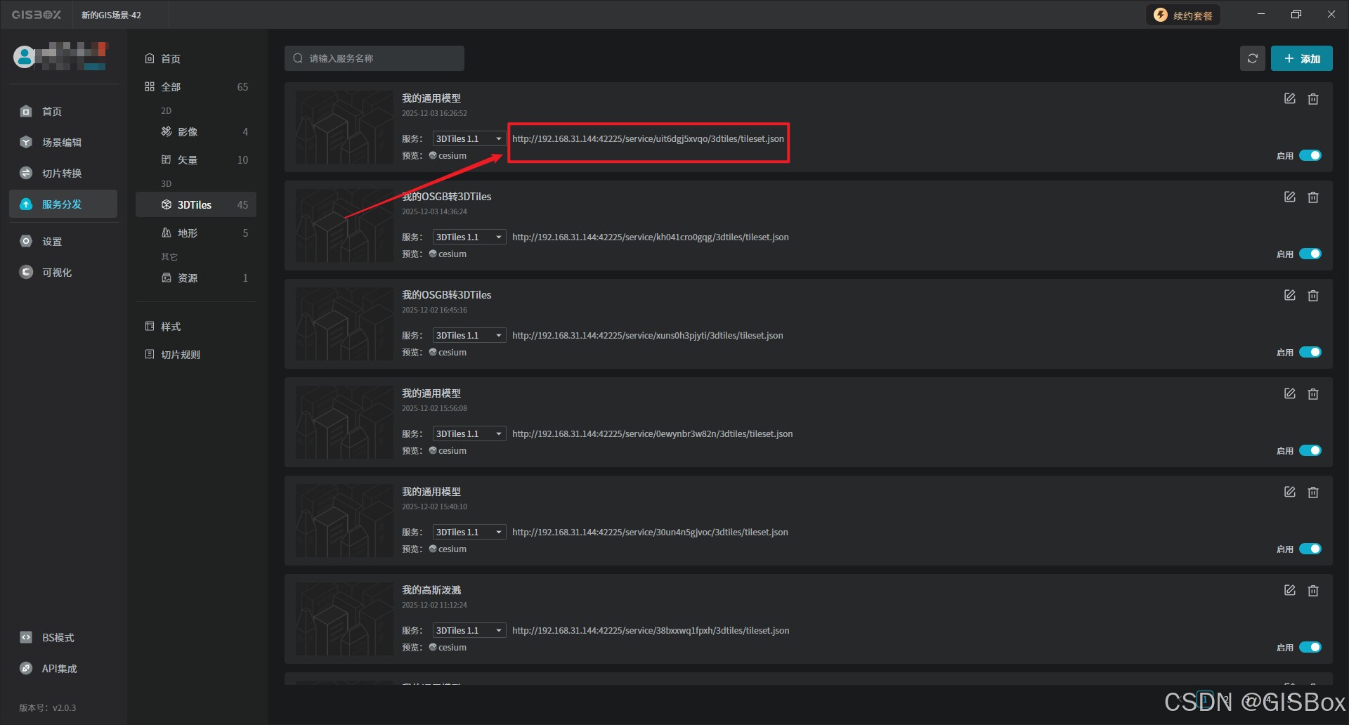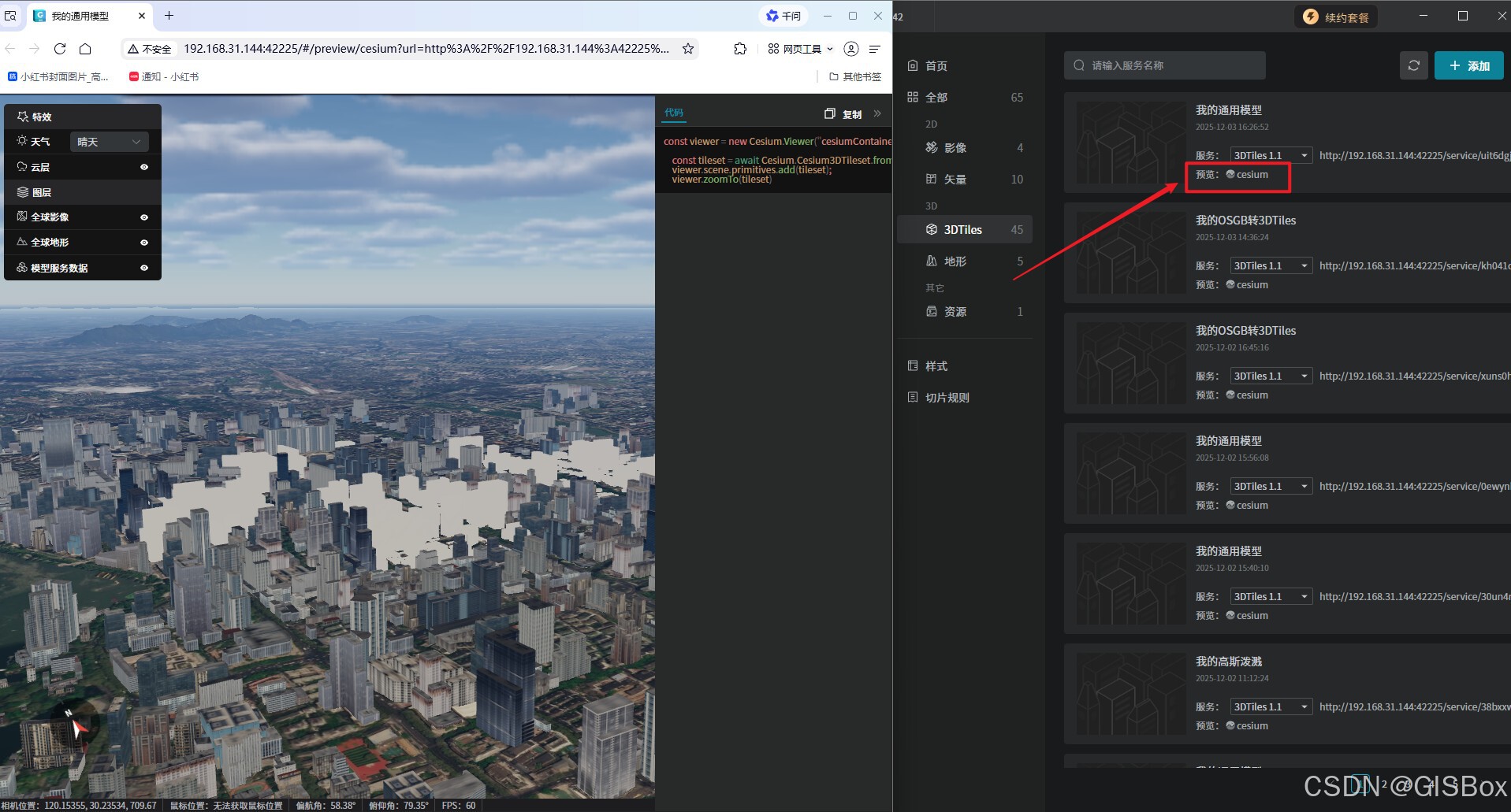 2、导出完成后,服务分发中就会自动添加一条服务,点击“cesium”按钮,浏览器直接预览效果。