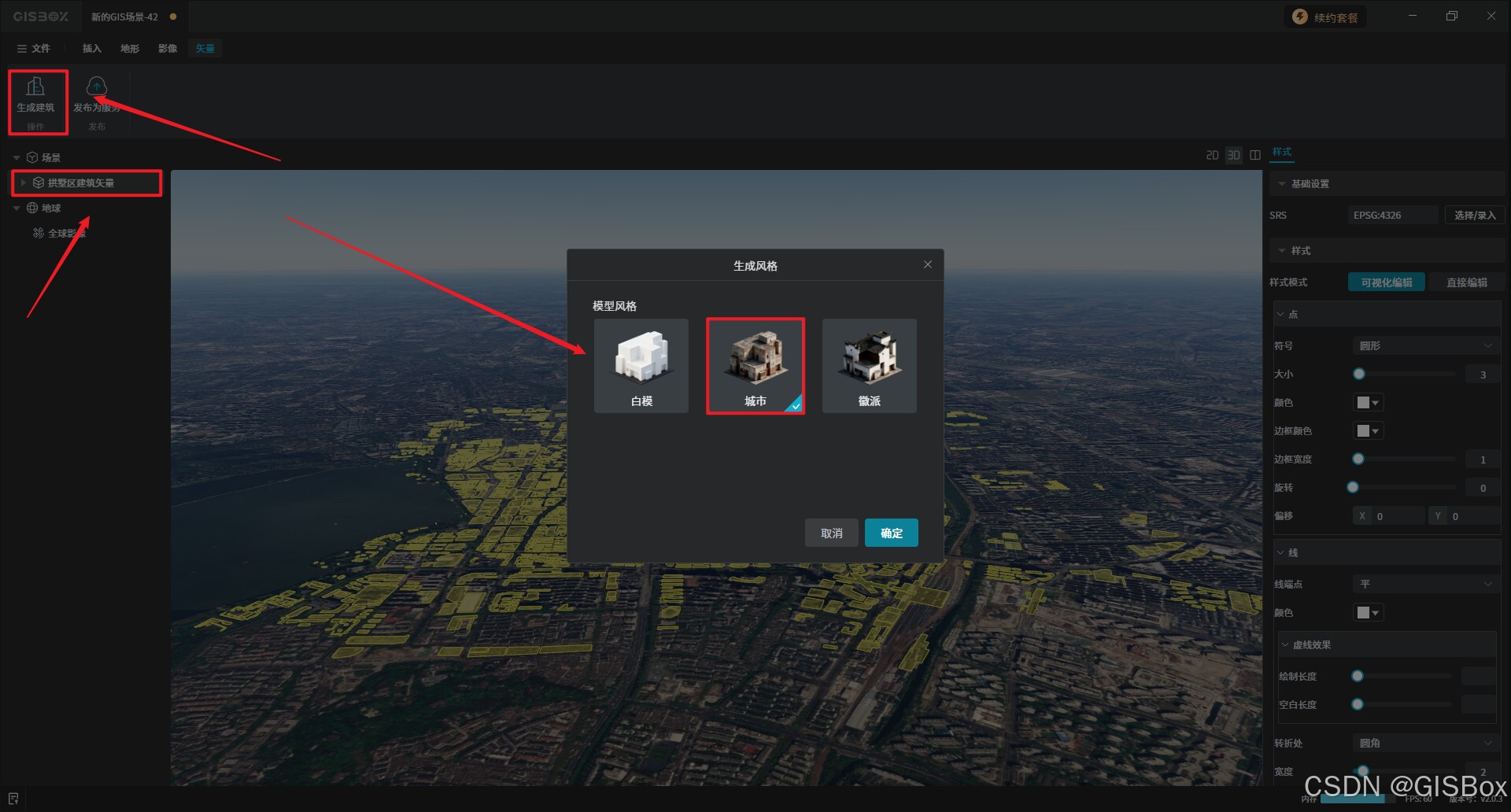 1、选中右侧场景中区域名称,点击左上角的“生成建筑”操作,在模型风格中选择“城市”。