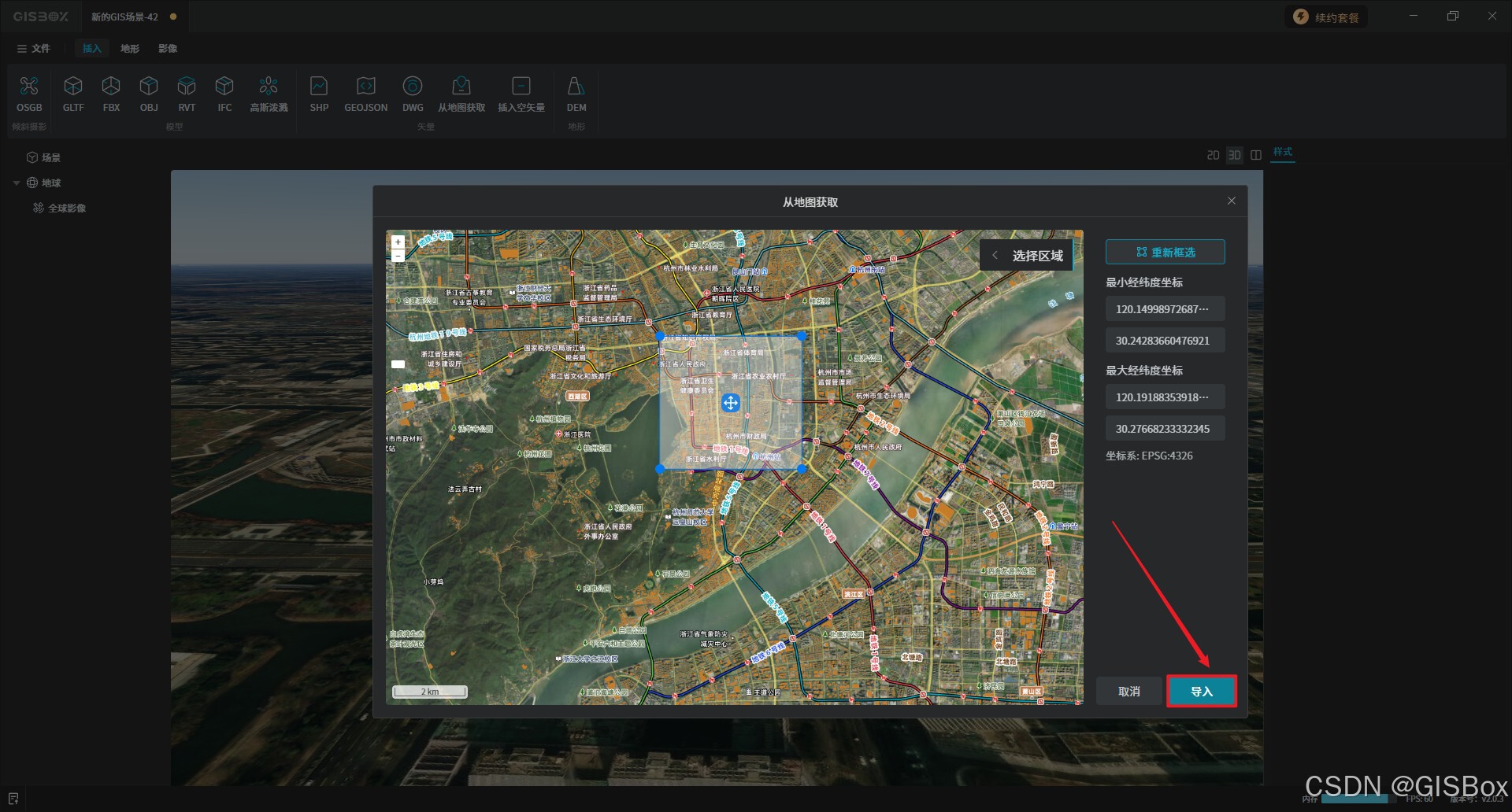 2、移动选框,从地图上框选需要生成的城市建筑模型,框选完成后,点击导入。