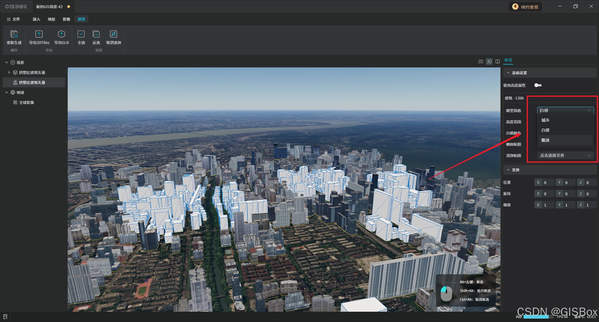 2、此时场景中自动生成建筑模型,点击任意建筑可修改其建筑风格,也可点击“全选”,进行风格统一。