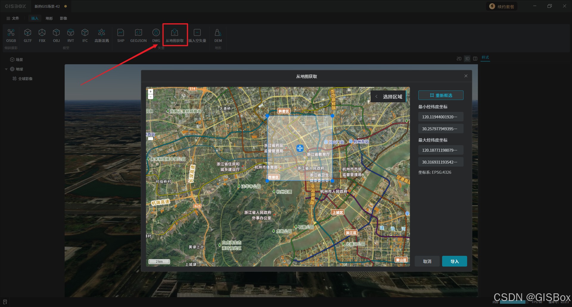 1、打开GISBox软件,新建场景,点击“从地图获取”。