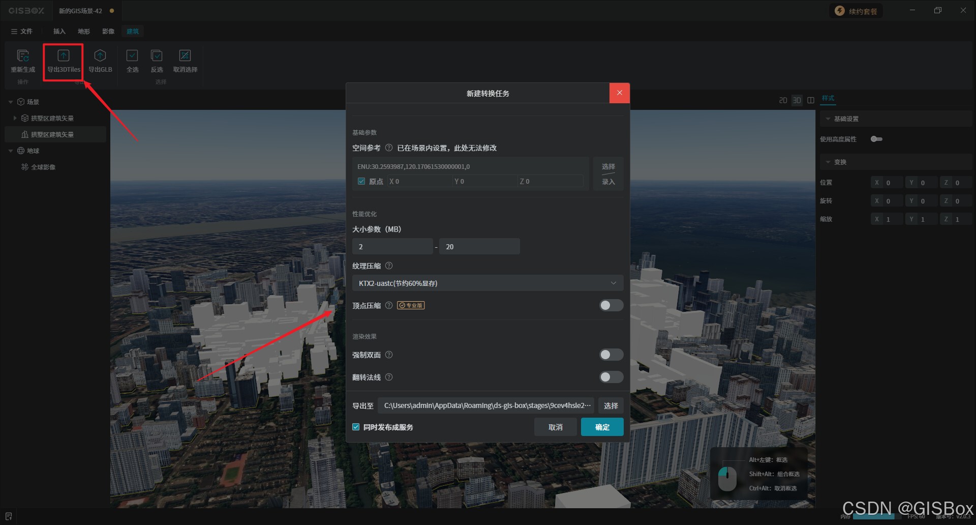 1、编辑好的建筑,可以将其发布为3DTiles格式。在右上角点击“导出为3DTiles”,并在新建转换任务中直接点击确定。