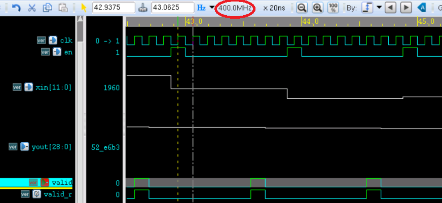 波形局部放大后如下图所示,此时输入数据有效信号 en 与输出数据有效信号 valid 是周期(50MHz)相同的脉冲信号,不是持续有效的。但工作时钟为 400MHz,所以输出也会呈现为 50MHz 采样频率下的 250KHz 频率的正弦波信号。