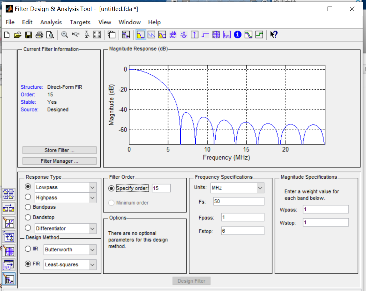 输入频率: 7.5MHz 和 250KHz 采样频率: 50MHz 阻带: 1MHz-6MHz 阶数: 15 (N=15)