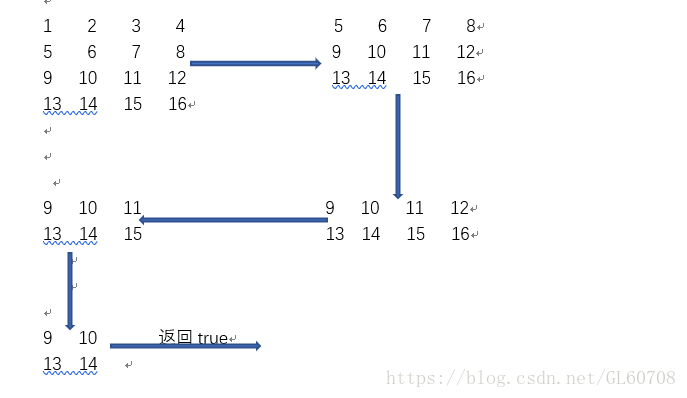 解法二:由于这个数组是从左到右,从上往下依次增大的,那么右上角的数字应该是本行中最大值,本列中最小值,。所以通过每次与最右边的值比较,如果相等,返回,如果目标大于最右边的值,那么行数+1,如果小于,那么列数+1。例如在下面二维数组中查找数字 10的过程。