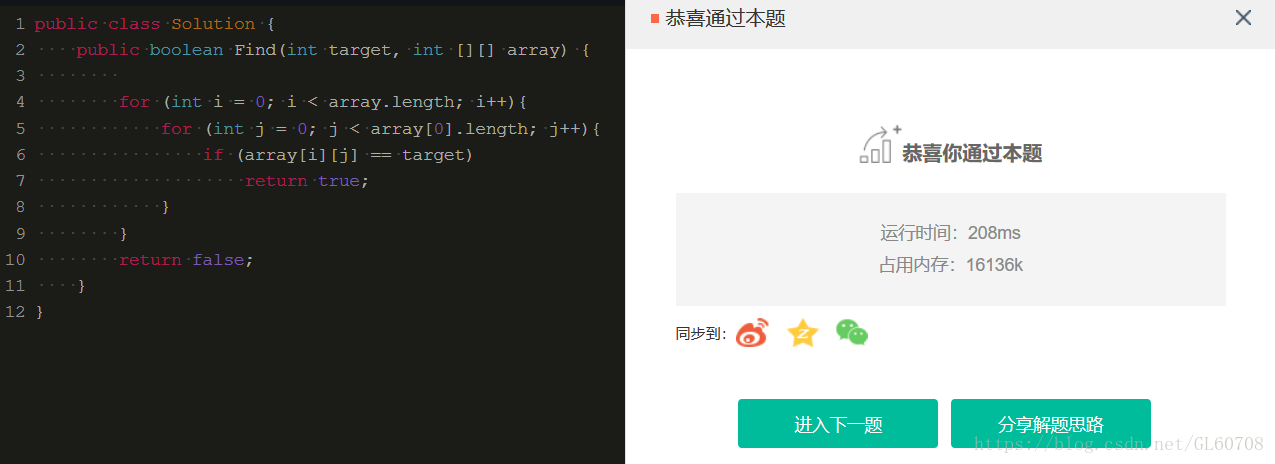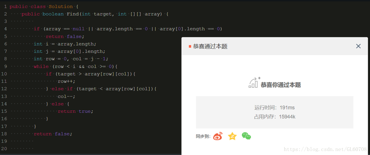 牛客网编程通过了,时间复杂度为n*m(其中n为数组的行,m为数组的列),面试的时候,估计这种解法难以打动面试官。