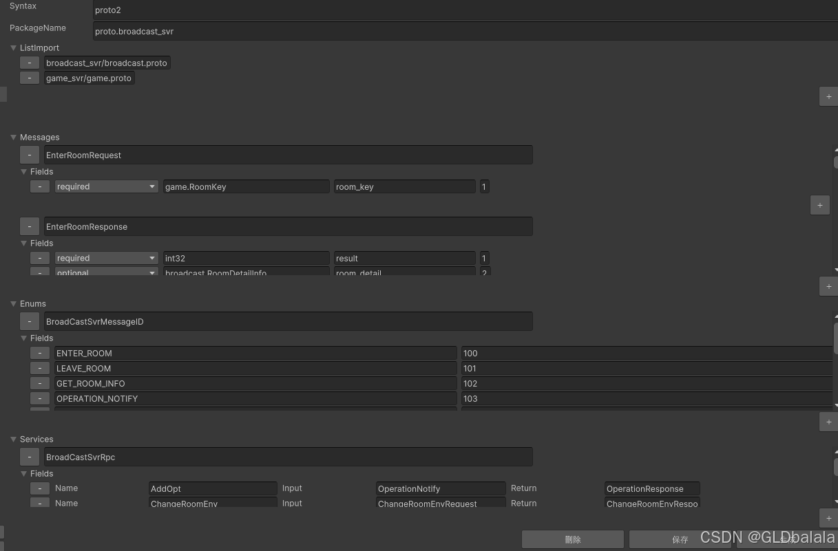 目前只支持Messages、Enums、Services编辑,通过+/- 增减字段以及成员。Messages 的字段没有对fields做序号校验,这里编写的时候需要留意。