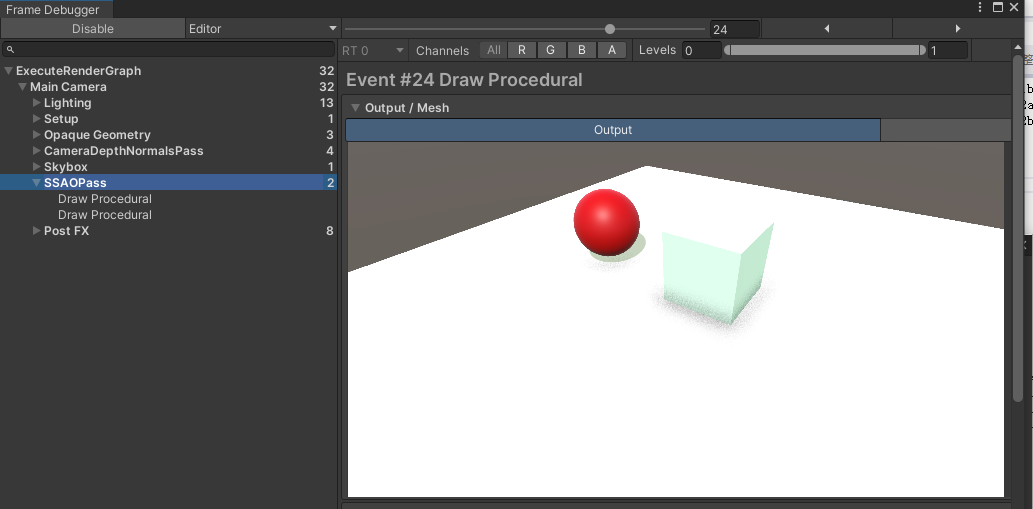效果还是有差别的,毕竟只是简化版本,而且与unity的不同,官方是在渲染物体之前先生成了AO贴图,这边我放在了渲染了物体之后,主要是因为unity在渲染法线图的时候把深度值也合并在了同一张贴图里。但这并不影响AO图的生成,AO图生成核心还是在这里,效果的优化也主要关心这一段。