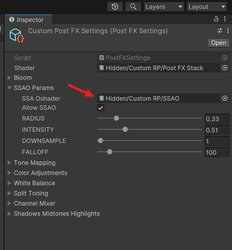 在后处理设置上添加SSAO.shader的引用