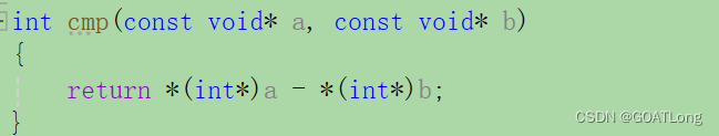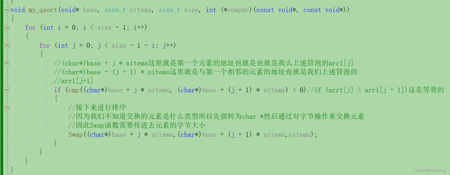 如图qsort函数需要四个参数我们一个一个来进行解析首先第一个参数void * base 是一个指针在这里之所以是void *是因为以便于各种类型的数组进行排序,也就是说base这个指针接收的是我们要进行排序的数组,第二个参数size_nitems就是我们要进行排序数组的元素的字节个数为了方便后续我们按字节来进行交换从而来实现整个元素的交换;第三个参数就是size_t size就是我么要排序元素的个数,最后一个函数就是一个比较函数根据我们比较类型的不同而改变。这个比较函数是我们在调用时要自己写的。