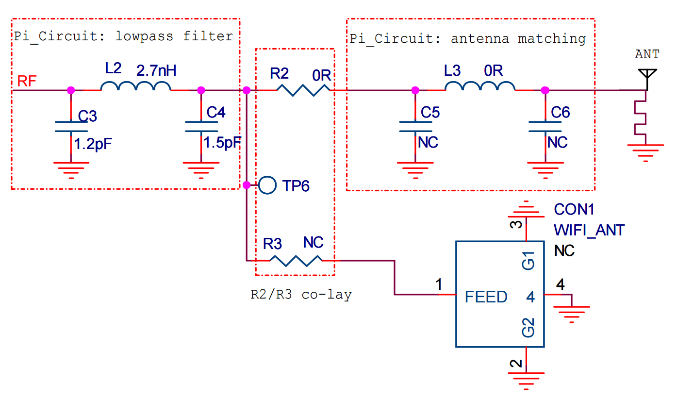 可以看到的,这里使用了两个π型电路,上面也贴心用英文标识了,左边是低通滤波的π型电路,右边地天线匹配的π型电路。