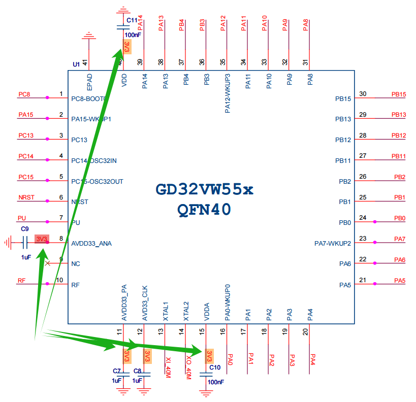 这个是为GD32VW553提供时钟的无源晶振电路,核心作用是给芯片输入稳定的40MHz时钟信号,负载电容没有焊接安装。
