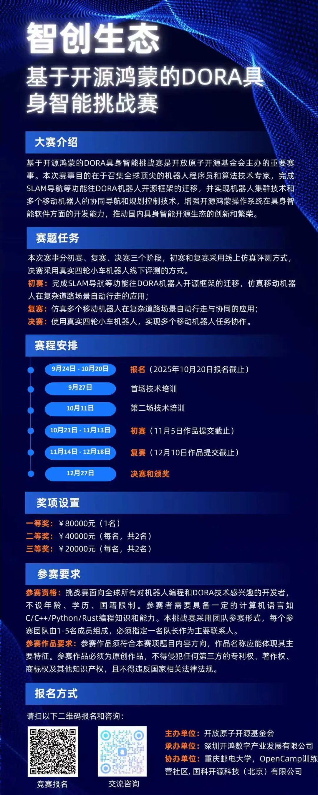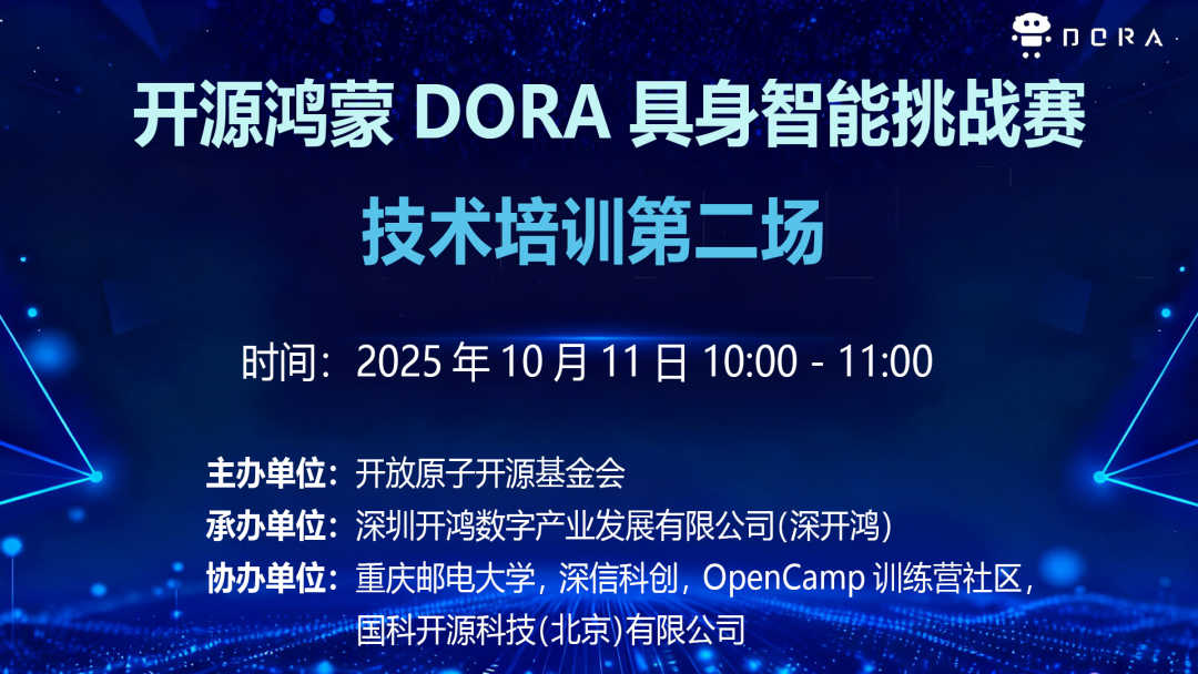 开放原子开源基金会举办的“基于开源鸿蒙的 DORA 具身智能挑战赛”第二期技术培训课程来啦!本次直播将带大家深入了解 DORA-RS 框架及编程技术,从设计理念到实战开发,全方位解析如何高效上手。