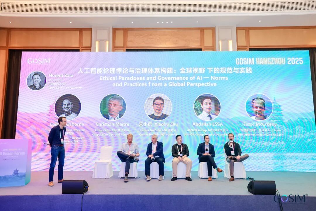随后,在开源 AI 倡导者 Florent Zara 的主持下,Linux Foundation Research 高级研究员 Cailean Osborne,Caspera.lab CEO 兼创始人 Christian Maitre,Center for Safe AGI 创始人朱小虎,AFNOR Group AI 与 NLP负责人 Abdallah ESSA,Egen 首席架构师 Jesse McCrosky 相聚一堂,围绕“人工智能伦理悖论与治理体系构建:全球视野下的规范与实践”主题展开对话,分享了各自领域在 AI 伦理规范、风险管理、技术透明度与全球治理方面的前沿实践和经验。