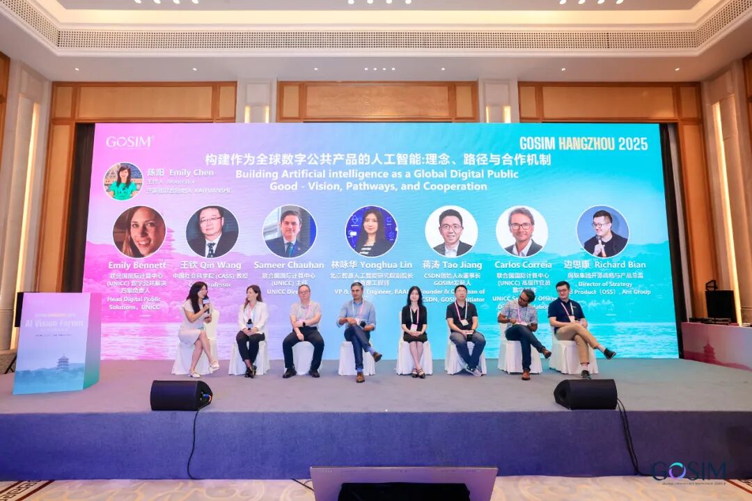 在《构建作为全球数字公共产品的人工智能:理念、路径与合作机制》主题下,由开源社联合创始人陈阳担任主持,来自联合国国际计算中心(UNICC) 数字公共解决方案负责人 Emily Bennett,中国社会科学院 (CASS) 教授王钦,联合国国际计算中心(UNICC) 主任 Sameer Chauhan,北京智源人工智能研究院副院长兼首席工程师林咏华,优快云 创始人&董事长、GOSIM 发起人蒋涛,联合国国际计算中心 (UNICC) 高级 IT 官员数字基础 Carlos Correia,蚂蚁集团开源战略与产品总监边思康共同围绕 AI 作为全球数字公共产品的设计原则、跨国协作机制、技术落地路径与治理实践展开了深入分享与讨论,为推动公平、开放且可持续的人工智能发展提供了全方位视角。