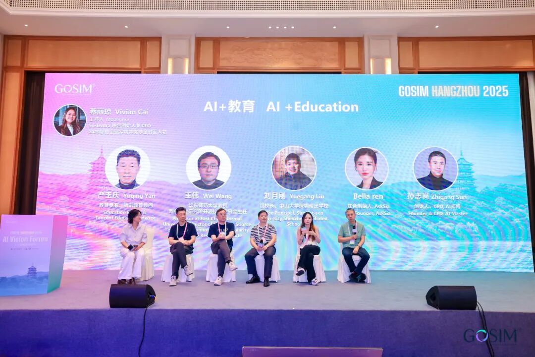 紧接着,在「AI+教育」圆桌对话中,由 Sustentra 联合创始人兼 CEO、2025 耶鲁企业家精神奖学金封面人物 Vivian Cai 主持,教育专家、腾讯教育顾问严玉庆,华东师范大学教授、奇点智能研究院开源技术委员会主任王伟,中山大学深圳附属学校副校长刘月刚,AskSia 联合创始人 Bella ren, AI 师傅创始人、CEO 孙志岗共同探讨了 AI 在教育场景中的双重角色:它既可能成为学生的“认知伙伴”,也可能演变为“算法监督者”。在这种张力下,教育公平、个人隐私以及教师角色的转型,正在面临新的变革。