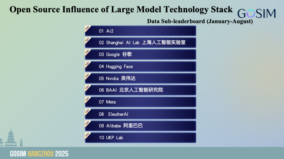 接下来我们看一下数据榜单,数据对于模型的发展非常重要。大模型之所以有今天的发展,也是因为有互联网公开的数据集。我们可以看到在这个榜单上,排在前三的是:第一个是 Ai2,它来自于美国西雅图的艾伦人工智能研究所;第二是上海人工智能实验室;还有谷歌。