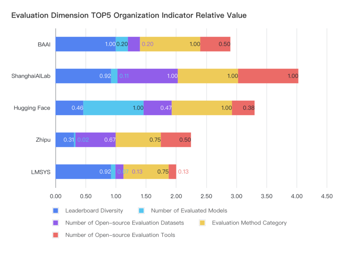 评测已成为推动大模型发展的关键环节。今年以来,开源评测数据集的数量一直在持续增长,其中上海人工智能实验室在开源评测数据集和工具数量上处于领先地位,Hugging Face 在参与评测的模型数量上遥遥领先,智源则在评测榜单多样性上表现突出。