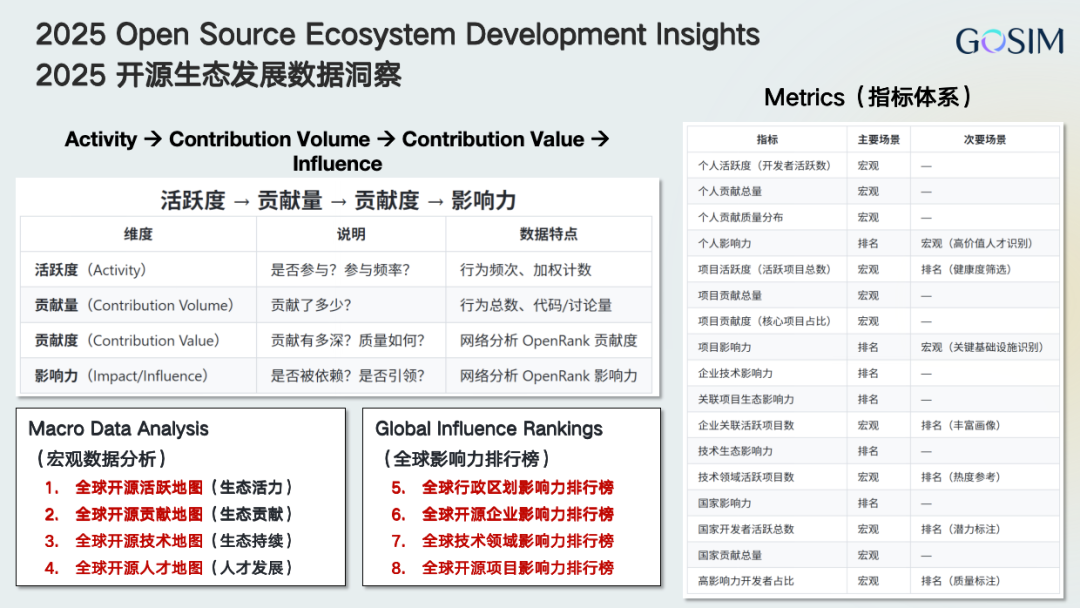 大家可以看到我们的 Metrics(指标体系)有非常多的指标。其中最主要还是来自于代码仓上 Commit 的数量、PR 的数量等,但最重要的还是参考 PageRank(网页排名)提出的一套“OpenRank”北极星指标体系,能够基于整个开源社区的开发者活跃行为来衡量评价对象(包括项目、企业、开发者等)的影响力或贡献度。