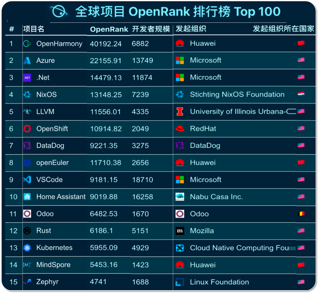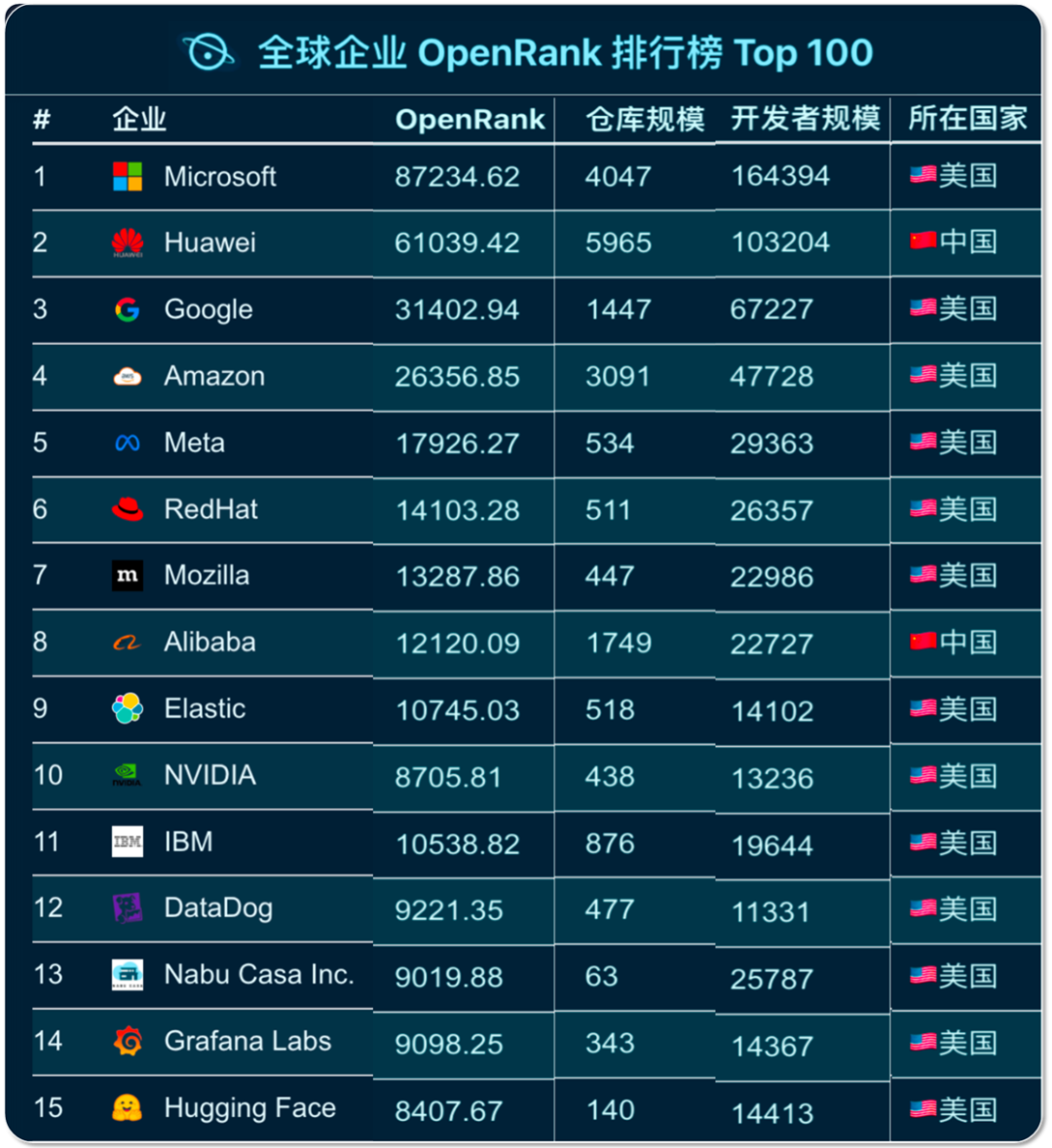 再看企业方面,分析全球企业 OpenRank 排行榜 TOP100 也可以看到,中国企业在开源领域有着非常快速的进展,以 16 家仅次于美国(65 家),TOP15 中,华为位居全球第二,阿里巴巴位居 TOP8。